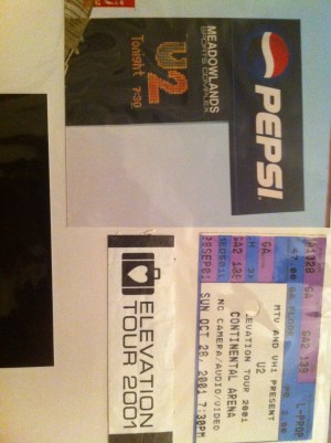 Elevation Jersey 10.28.01 Set List: Elevation, Beautiful Day, Until the End of the World, New Year’s Day, I Will Follow, Sunday Bloody Sunday, Stuck In a Moment, Kite, Angel of Harlem (full band – electric), Please (acoustic – Bono, Edge, and guest), All I Want Is You, Where the Streets Have No Name, I Still Haven’t Found What I’m Looking For, Pride, Bullet the Blue Sky, What’s Going On, New York, One, Peace on Earth / Walk On.