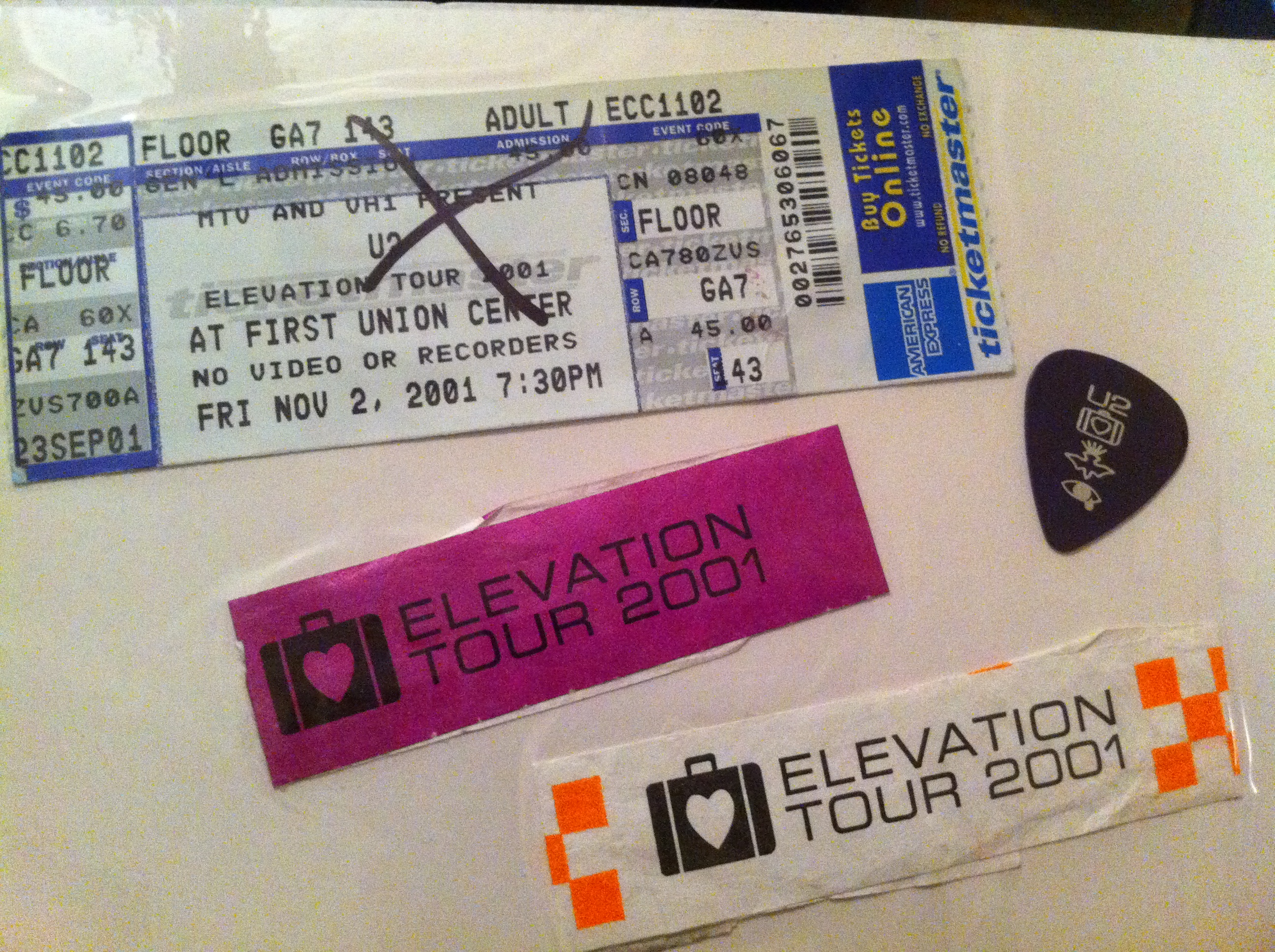 Elevation Philly 11.2.01 Set List: Elevation, Beautiful Day, Until the End of the World, New Year’s Day, Out of Control, Sunday Bloody Sunday, Stuck In a Moment, Kite, Wild Honey (acoustic), Please (acoustic), Bad / 40, Where the Streets Have No Name, I Still Haven’t Found What I’m Looking For, PrideBullet the Blue Sky, What’s Going On, New York, One, Peace on Earth / Walk On.