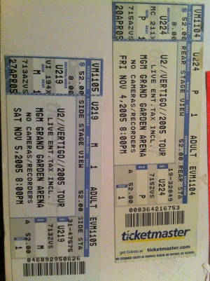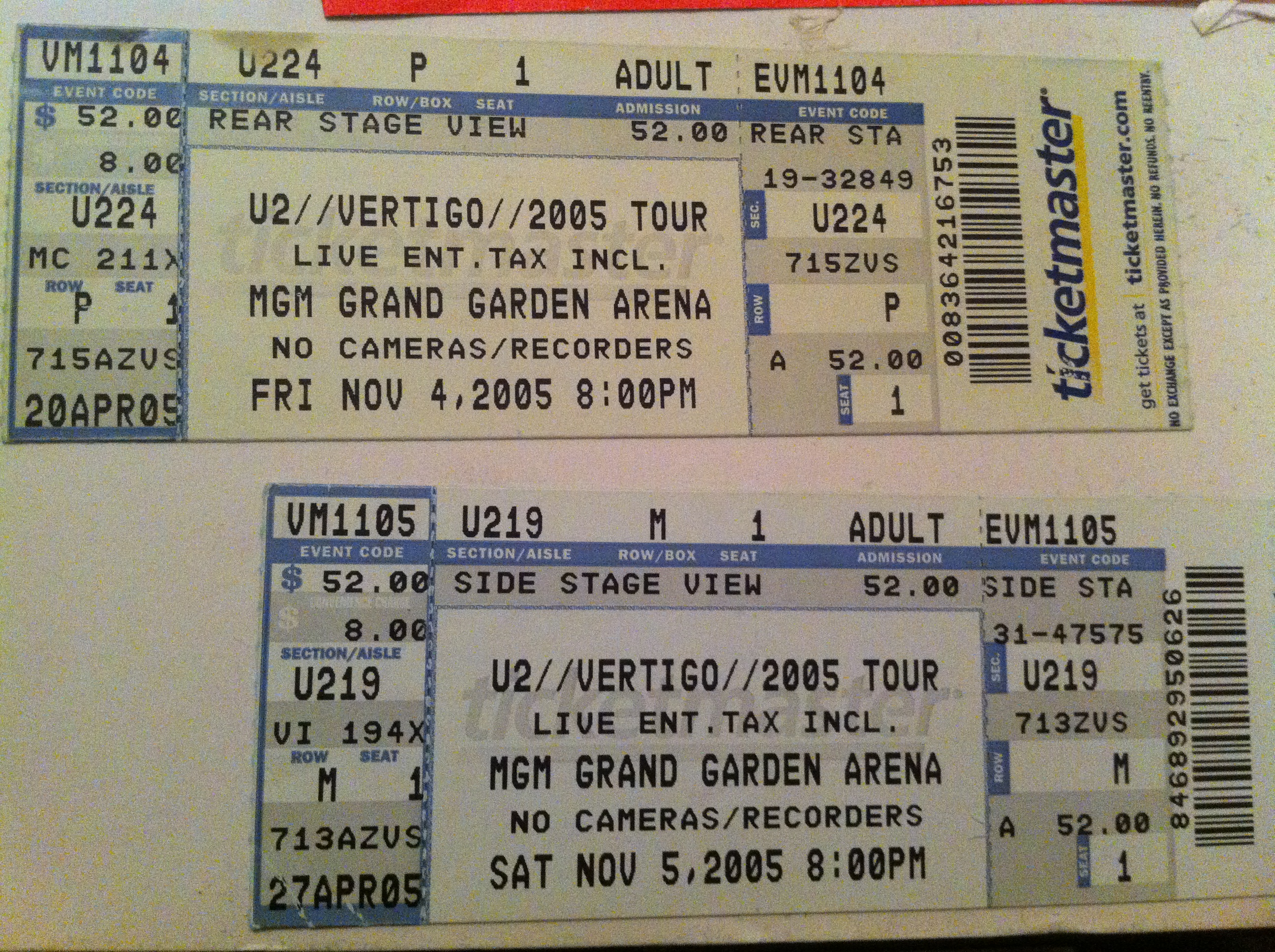 Vertigo Vegas2 11.5.05 Set List: City of Blinding Lights, Vertigo, Elevation, Mysterious Ways, Until the End of the World, I Still Haven’t Found What I’m Looking For, Beautiful Day – All These Things That I’ve Done, Miracle Drug, Sometimes You Can’t Make It On Your Own, Love and Peace or Else, Sunday Bloody Sunday, Bullet the Blue Sky, Miss Sarajevo, Pride, Where the Streets Have No Name, One, Zoo Station, The Fly, With or Without You, Happy Birthday, All Because of You, In a Little While, Bad.
