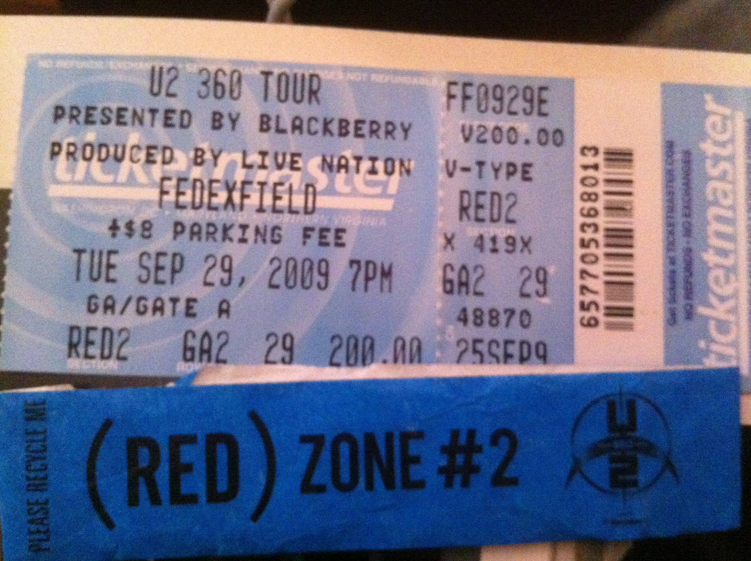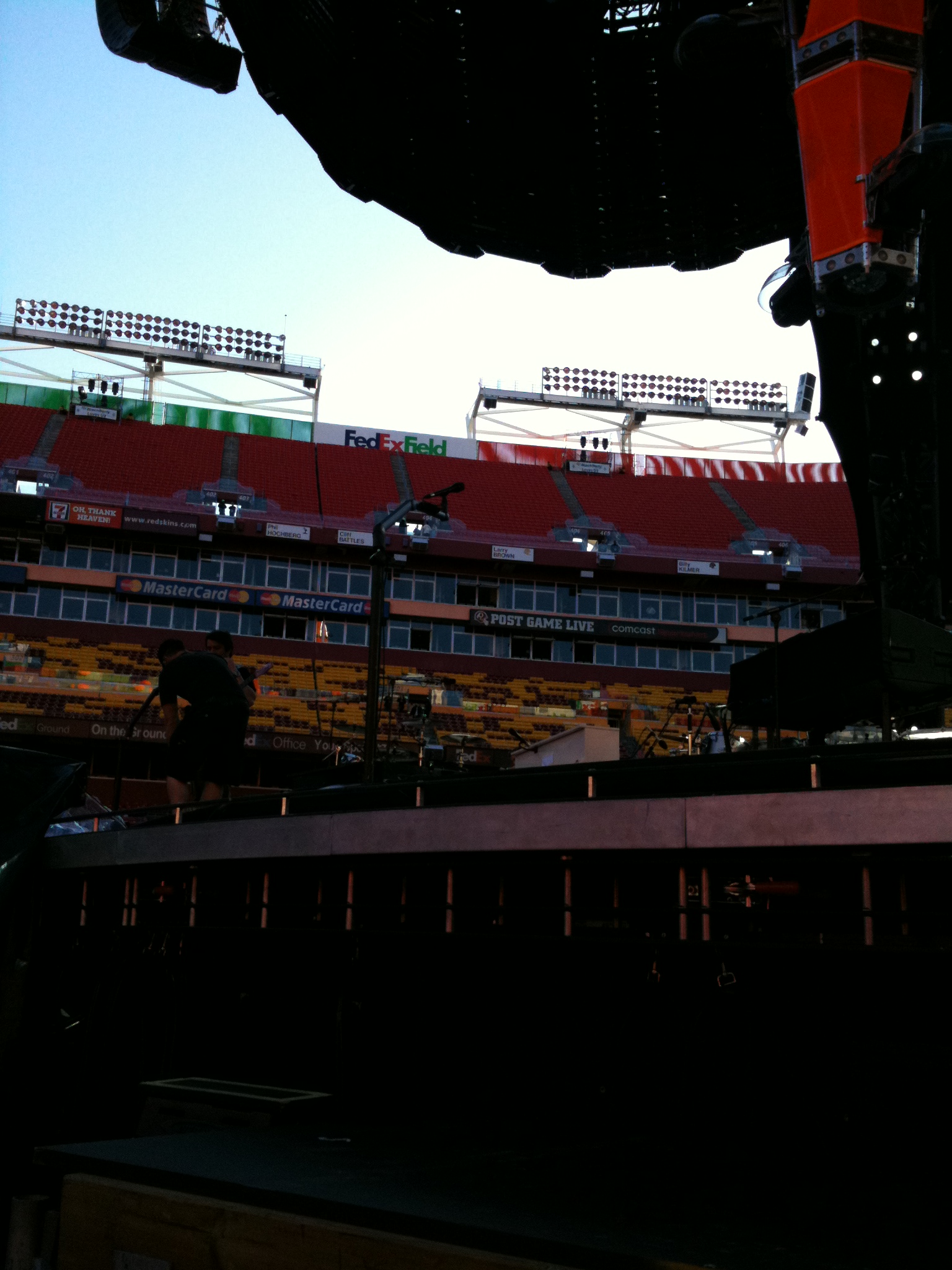 Today started with me waking up at 5am for no reason. I left the house at 2pm, was parked at FedEx Field by 3, said Hi to Jennifer in the GA line, got my red zone ticket from Shannon, and was in the red zone line by 3:30. I was about 10th in line. Kelly Brewer came and stood with me and we talked. Then they split the line into boys and girls to search us. They let us in around 5:15 when everyone else went in, but no one told us where to go. We weren’t at field level. It took forever to get down there. Instead of going into the designated Red Zone, I went inside the circle on the front rail in front of Adam. I had my doubts that the stage was too high and I wouldn’t be able to see that well, but it turned out to be a blast and my favorite show so far this tour (better than Chicago). Muse opened. There were ok. I see them 3 more times, so I’ll form an opinion later.