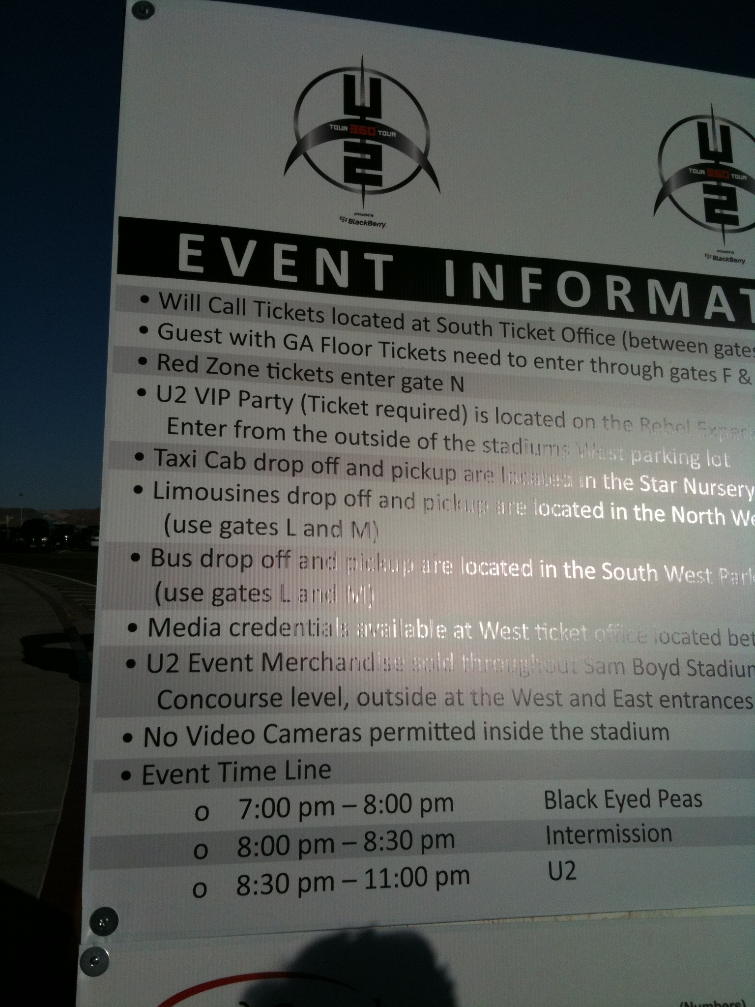 I flew into Vegas around 10am (cst), waited an hour to get my rental car and got to the hotel around 12:30 (pst). Tasha and I had lunch at the Red Rocks casino buffet where we were staying, and we were at Sam Boyd Stadium at the University of Las Vegas by 3. We saw Ruth, Melissa and Matt (who just married), Babette, Ayaz, Otto, Melissa. Bono stopped and signed autographs and talked with everyone waiting. Unfortunately, we were stuck behind the fence, so we just got pictures.