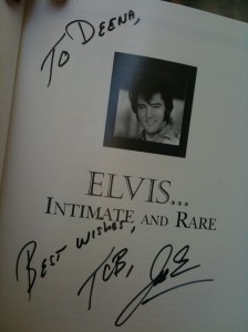 Woke up at 8am, got ready and hit the slots. Played for about 2 hours and was down $33. Tasha woke up and we went to lunch at 11:30. We went downtown to Freemont Street to recreate the Still Haven’t Found video. I saw Joe Espisito, met him, and he autographed his picture book ‘Elvis Intimate and Rare.’ I was wearing an Elvis tee which he said he liked – twice. I told him I lived in Memphis. I asked if he was going to be there for birthday week, but he said he was going to be in Vegas for the opening of Viva Elvis Cirque de Soleil show. It was SO cool to meet Joe, and so unexpected! I was SO excited and nervous.