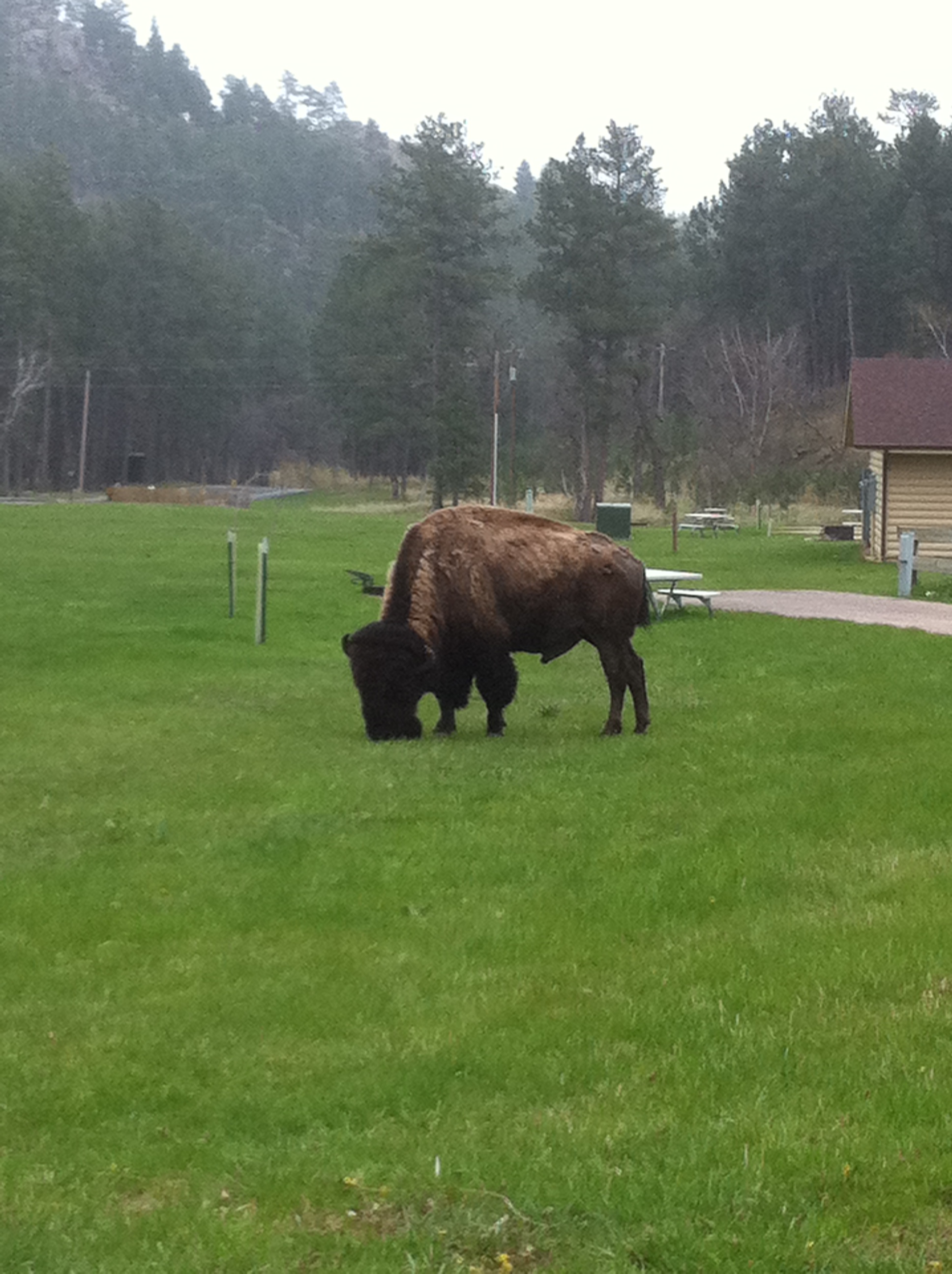 We left Crazy Horse tired and cold wanting to go back to our hotel for a bit to rest before dinner. Rather than go back the way we came, we continued around the circle which ended up taking us through Custer National Park on the most treturous road on which I’ve ever driven. It took us over an hour to drive 34 miles, but along the way we got to see Buffalo. I was a bit terrified they were going to charge us. The one I was taking a picture of looked me in the eye – and not fondly.