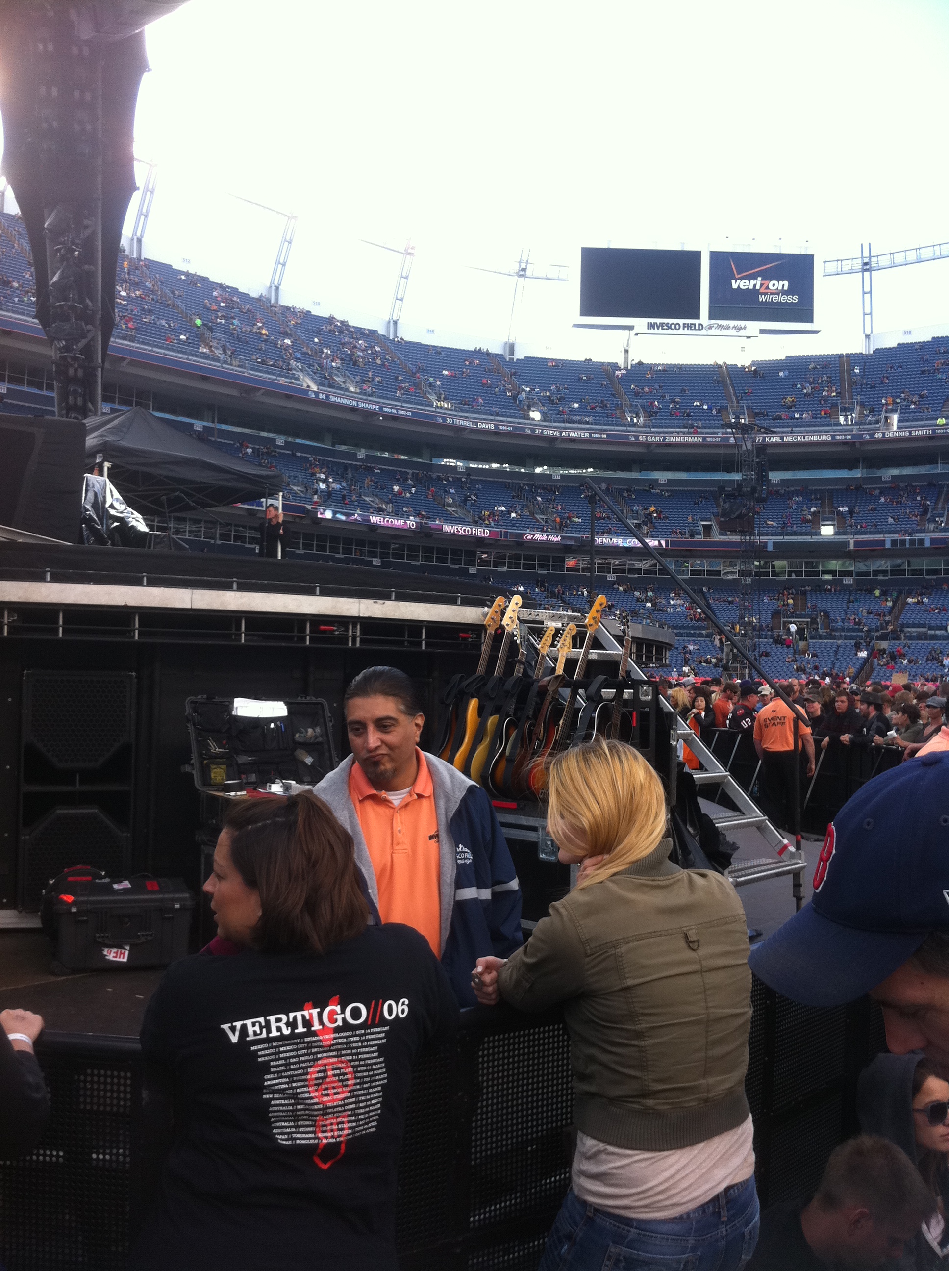 After a short nap, I went back over to Invesco Field around 4 and waited for the band to arrive. Bono and Edge arrived after 5:30. They both got out and signed for the fans. Then Larry and Adam drove by, but did not stop – they didn’t even roll down the window or wave. I casually walked in the GA entrance after 6pm – no line, no stress. I went to Adam’s side inside the circle. I ran into my friend Mike, my oldest U2 friend – we used to go to all the U2 shows together on ZooTv and Popmart and spend hours and hours watching U2 footage. Mike and I decided to go over to Edge’s side. It was a good opportunity for me, since I wasn’t with Tasha (big Adam fan). Edge’s side was more crowded, so we were actually a little bit behind the stage on the side. But I didn’t mind because I was going to go behind the stage a lot anyway to watch Larry – and when Bono and Edge went back there.