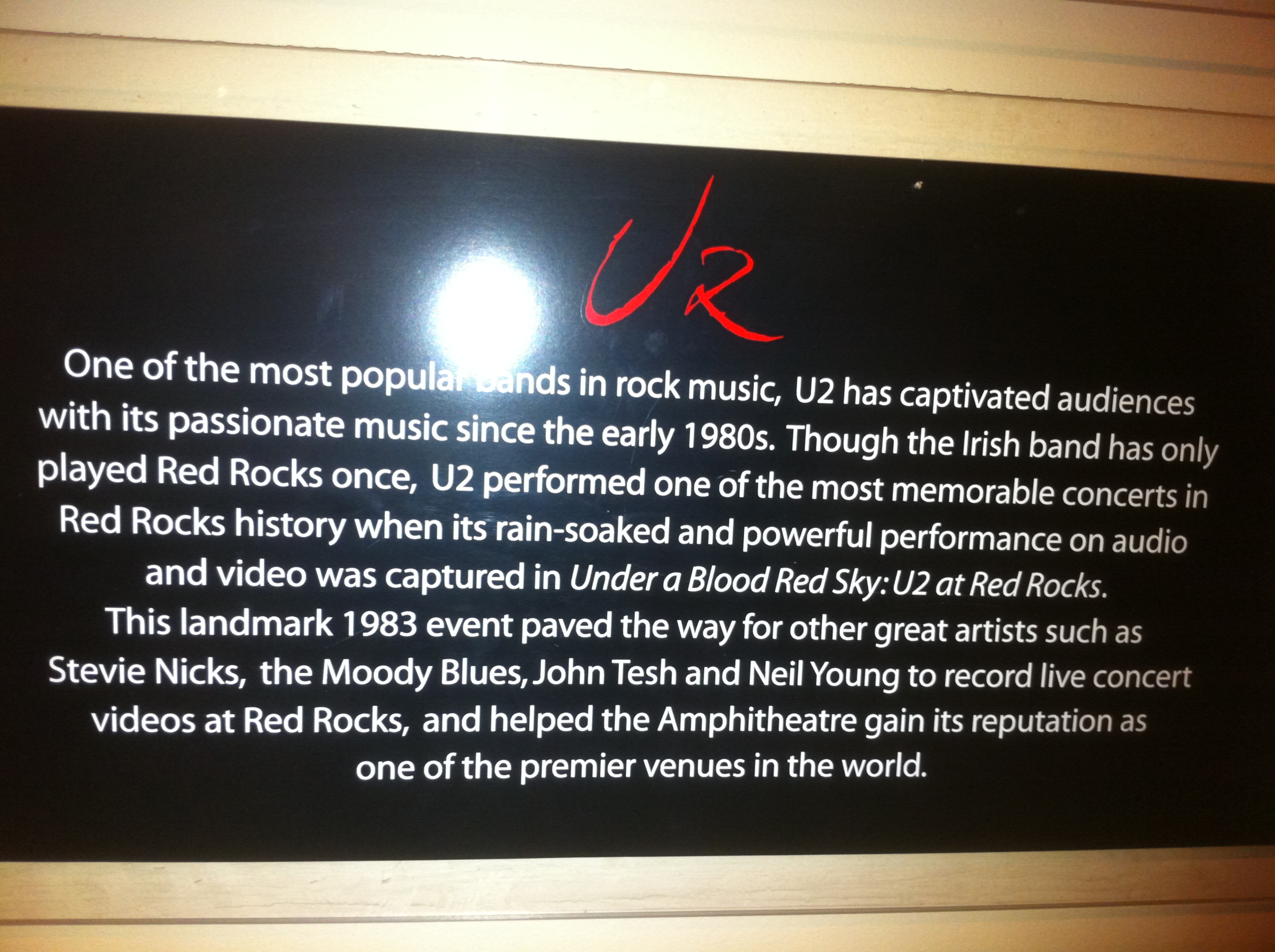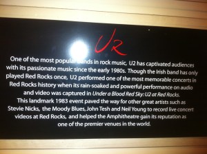Before leaving for Salt Lake City, I had to do one more thing in Denver. Yesterday we went to Red Rocks. I have been there once before, back in 1998, and got my picture taken on stage but never went to the visitor center or musuem. My mom and aunt were impressed with the park, and I of course was excited to see the U2 memorabilia and just to be in the presence of that magical show from 1983.
