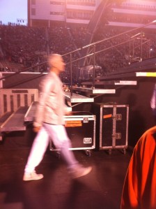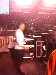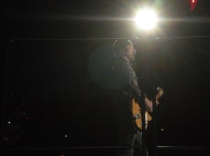 I decided to stand on Adam’s side of the stage in the inner circle. I had a nice view of the stage, but then it got so crowded. I think they let too many people inside, so I moved over more toward the side. I again ran into my friend Mike. I also ran into Matt and Melissa, my friends from Elevation. It was great to see U2 with them again. I decided to go over to Edge’s side to watch U2 enter again. Larry did not see me or wave to me this time though. I did get 4 photos of each band member entering, but they are blurry. I also got video of their entrance, but it is a little shaky.