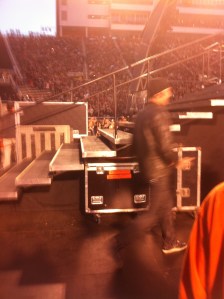 It was still light out when U2 took the stage. After watching U2 enter, I went over to Adam’s side to watch the show. Then I went back to the soundboard during Walk On to watch the end of the show. I have never seen it from the back. It’s really cool with all the screens and lights on the claw, and I especially enjoyed the Joshua Tree footage during Streets.