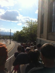 I left for Rice-Eccles Stadium just after 3pm and although it was only a couple of miles from my hotel, I didn’t actually get into the GA line until almost 4pm. It took a while to find the general parking lot and then to walk to the stadium from that lot. The good thing was that parking was free – free! That almost never happens at a U2 show. I wasn’t going to get in the GA line. My plan was to hang out for a bit in the GA line and then go wait out for the band to arrive, but I ended up talking to some people in the GA line and running into Jason, a friend I have been talking with on Twitter the past few months and finally got to meet in person. I also signed up (again) for the One campaign, talked to people about my trip to all the US shows and handed out some U2TourFans stickers.