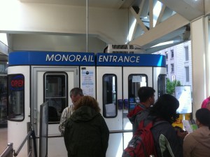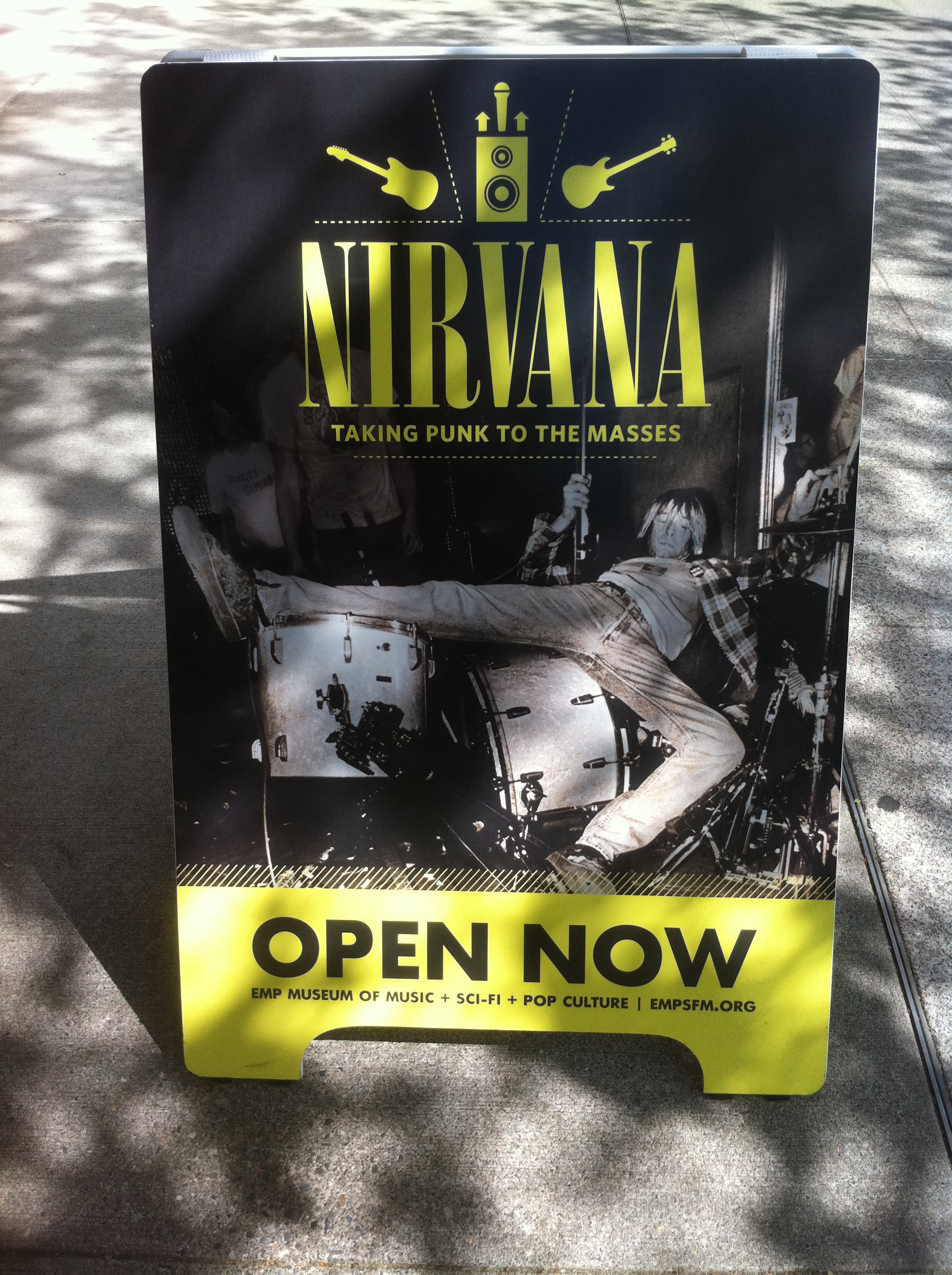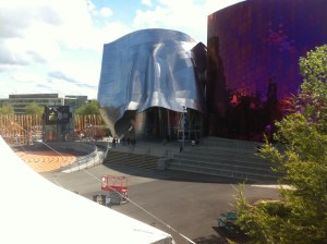 We started out our day with breakfast at the Blue Water Taco Grill. I had a yummy veggie scramble. Then we walked to the Monorail, which is still operating from when it started at the 1961 World’s Fair – the same fair where Elvis filmed It Happened at the World’s Fair. The Monorail took us to the Space Needle, but we didn’t go up in it. I went up in it 10 years when I was here for U2’s Elevation show in Tacoma. But right next to the Space Needle is the Experience Music Project, which is currently showing a Nirvana exhibit – the reason why I came to the EMP.