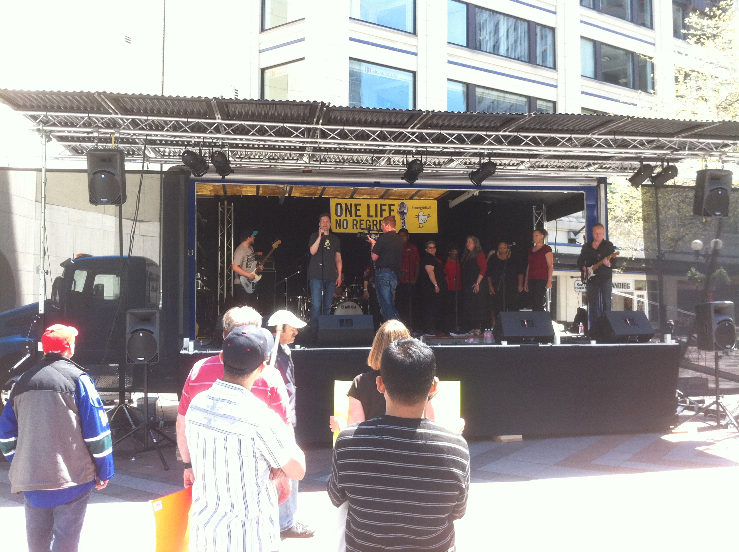 After the EMP, we wanted to take a bus tour and had only a short time to make it. While we were rushing to catch the light rail, we heard the drums for Desire. We paused because we weren’t sure we heard it correctly, but then we heard ‘Lover I’m on the street.’ We ran toward Desire. It was a band and gospel choir on the back of a semi truck. The banner above the stage read One Life No Regrets and then in smaller letters noregretsu2.