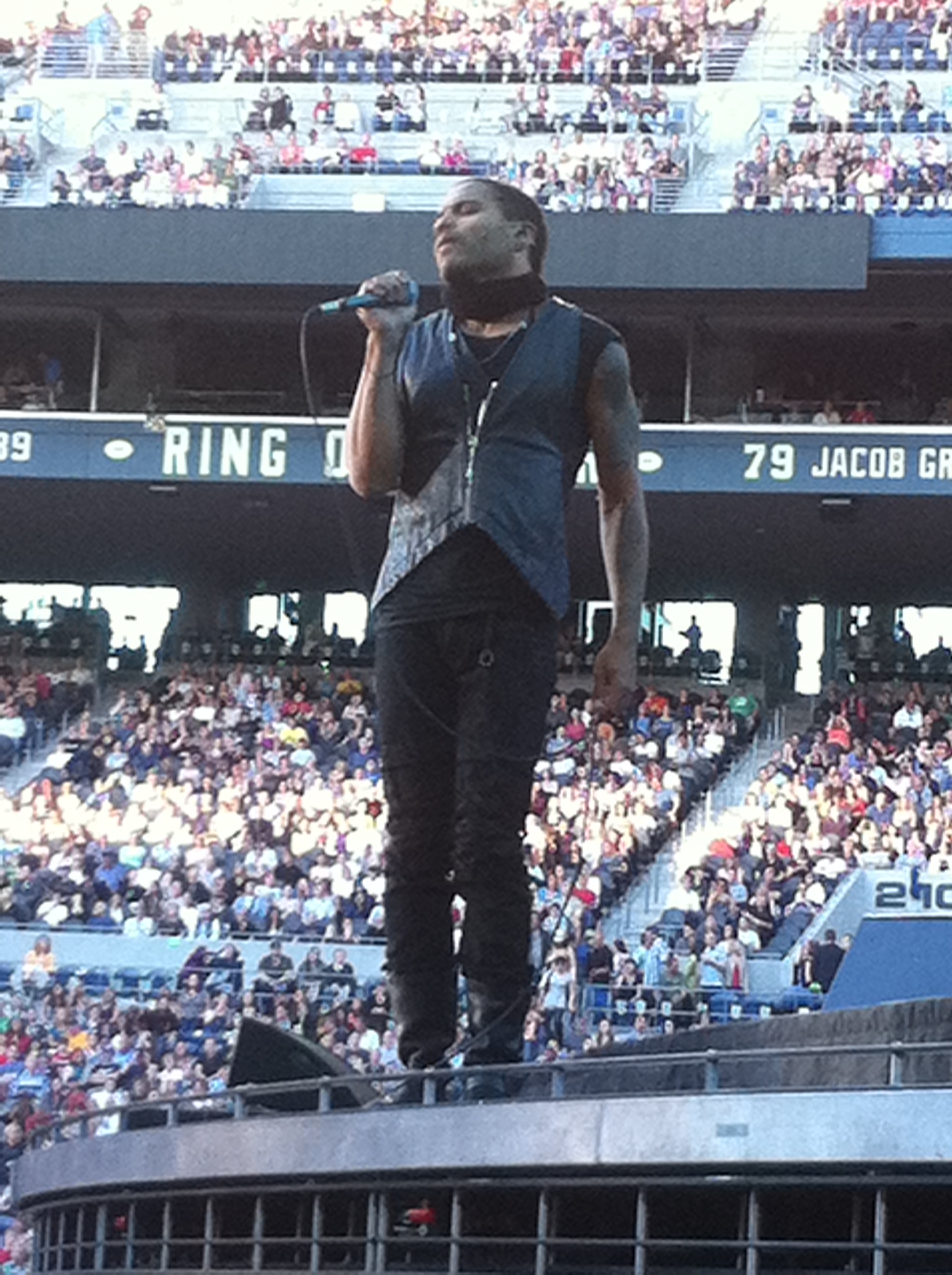 Lenny was a great opening act, a lot better than The Fray. He didn’t take the stage until 7:30 and only played 45 minutes, but played the four songs I know – It Ain’t Over Til It’s Over, American Woman, Fly Away, and Are You Gonna Go My Way. Lenny had these great female backup singers that reminded me of Elvis’ Sweet Inspirations. Lenny also did karate moves that reminded me of Elvis. Could Lenny be a fan of The King?
