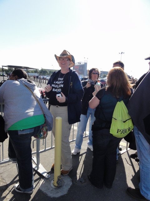 Even though my hotel is less than a mile from the stadium, I took the hotel shuttle over to the Coliseum just after 2:00. I walked around the stadium and arena and finally found my friends waiting for U2 to arrive. Bono arrived just after 5pm, stopped the car right in front of us and hopped out.
