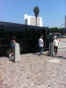 Next we were off to the beaches. We drove on Santa Monica Boulevard, which is route 10 – the longest freeway in the US from the west coast to Jacksonville, Florida. We didn’t stop in Santa Monica, but drove by the Santa Monica Pier. It was cloudy at the beach, but I could still see the pier. We then stopped at Venice Beach, and what a crazy place that is. It was a crowded cement boardwalk full of street vendors, dogs, bicycles, segweys, skateboarders and roller skaters. I saw someone pass out and the ambulance came for him. I also got in the filming for a Lipton tea commercial. It was quite an eventful 45 minutes.