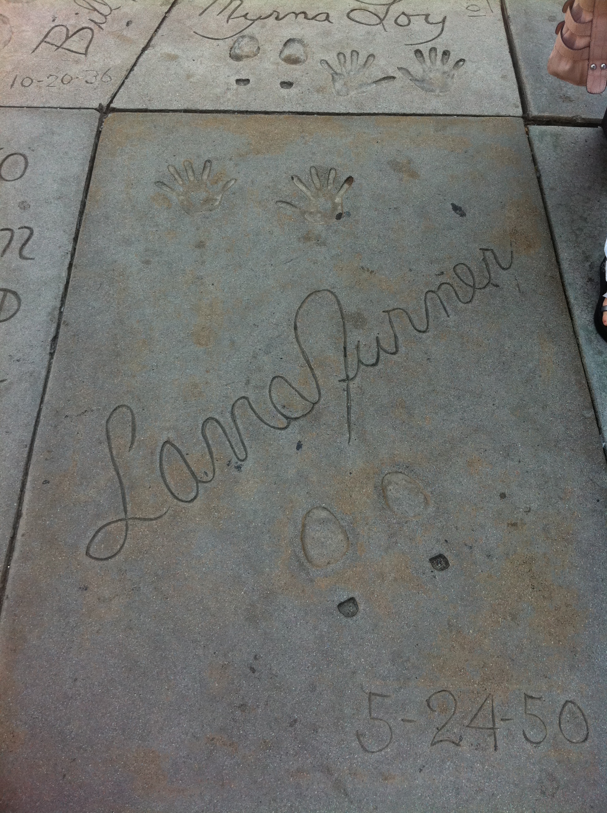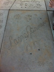 On our way to Hollywood, we drove by the Capitol Records building. Then across from the Hollywood Bowl, I spotted Bret Michael’s tour bus parked with the shades closed. I found out that he was playing at the Hollywood Bowl that night. We finally made it to Hollywood Boulevard and got about 45 minutes to walk around. I walked down the Walk of Stars and saw Mickey Mouse at his star and then came upon Olivia Newton-John’s star, which is the only thing I remember from our 1984 trip. I walked passed the historic Roosevelt Hotel to check out the footprints at Grauman’s Chinese Theatre. The first I saw was for the movie Giant, which consisted of the footprints of Rock Hudson and Elizabeth Taylor. It should have also included James Dean, but he died, so instead director George Steven’s footprints were included. I came across the footprints of Natalie Wood, Bing Crosby, Paul Newman and Joanne Woodward together, Roy Rogers and Trigger, Dean Martin, Marilyn Monroe, Bette Davis, John Travolta, Nic Cage and finally Lana Turner. I searched everywhere for my favorite actress Lana Turner’s footprints and finally had to ask someone to consult the map.