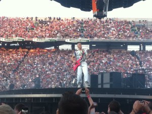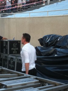 I went into Spartan Stadium at 8pm and still got inside the inner circle. There was so much room and behind the stage was smaller, narrower. We didn’t have wristbands and were not allowed to go up into the stands for concessions or bathrooms. There were no red zones. I stayed on Adam’s side of the stage because I realized U2 were again going to enter on Adam’s side – this was the first time I haven’t been on Edge’s side of the stage to see them walk under the stage. They actually entered through the stands – walking down the bleachers through the fans. U2 started their walk to the stage just after 8:45, and it was still light out and stayed light until 9:40 through. Please watch my video of U2 entering Spartan Stadium http://www.youtube.com/watch?v=I7cuHvjwUDA