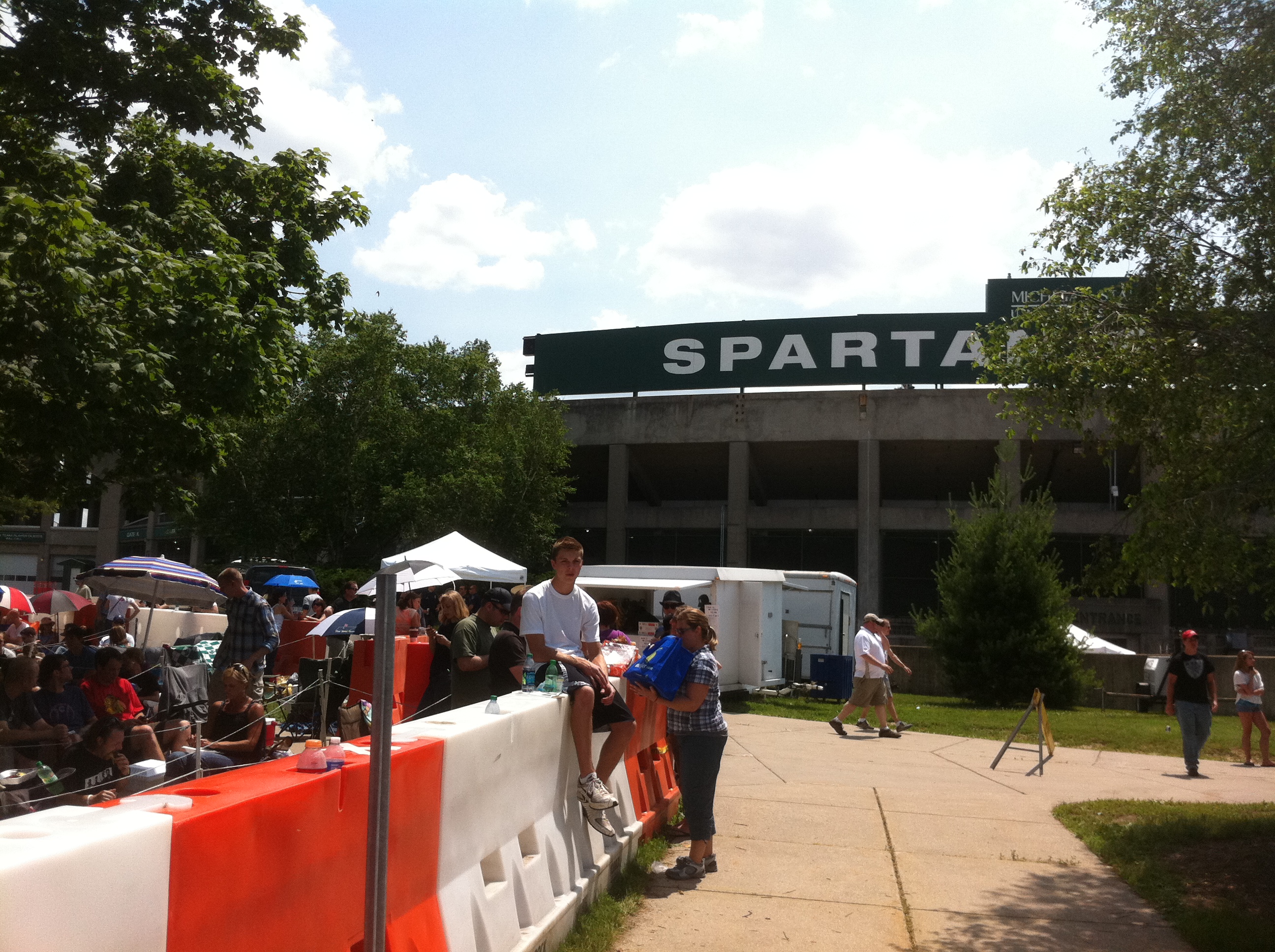 I started off my day in Michigan relaxing in my hotel room, ordered a pizza and walked to Spartan Stadium around 1:30. I walked around the stadium to the GA line, which seemed very calm and happy. It was right by the entrance the crew was using to go in and out of the stadium, so everyone assumed U2 would be arriving there – but it was the opposite end of the stage. I walked around the stadium to see if there was anywhere else U2 could drive in. When I returned to where I started, Dallas and Sammy were also walking back. I asked Sammy if U2 were really arriving here in front of the GA line, and he said there was no else to come in. Then Dallas asked how I was doing and shook my hand. A little while later Rocco informed us that U2 was not doing a soundcheck, so this indicated to me that U2 was going to arrive very late. I decided to go back over to where the catering was set up and where the crew was going in and out of. There was no back stage in the stadium – no dressing rooms. They had set up ‘backstage’ at the hockey arena around the corner. I waited there, later joined by Beth and Tim. We stayed until almost 8 and nothing. We saw Florence and the Machine arrive and leave, but no U2.  We learned later that U2 was driven right up to the stadium and let out there.