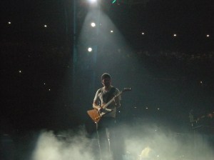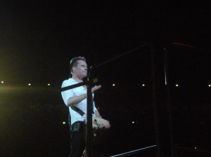 As if I wasn’t excited enough, or hot enough, from Get on Your Boots, Bono started his usual talk before I Still Haven’t Found What I’m Looking For. He read the set list from a show U2 played in St. Louis 30 years ago. I thought they would play an impromtu old song, especially when everyone cheered when he read Out of Control, but they didn’t. Then Bono started the band introductions. He said, ‘Larry is still upset that we changed our name to U2 from the Larry Mullen Band and there are some people here that agree with him’ – and Larry busted out laughing. Everyone thinks Bono was referring to me, and maybe he was since he and Larry did clearly notice me on the way to the stage. Please watch my video of Bono’s band introductions http://www.youtube.com/watch?v=ZliD-wUhH_8