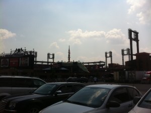 After lunch, we made our way to Busch Stadium to try to figure out where U2 would drive in. Luckily, the spot we chose was in the shade. My friend Chuck and Beth’s friend Tim were there. We also ran into Cathal and a few others. There was a bit of discrepency where the band was actually going to drive in. There were a lot of people on the other side of the stadium waiting, and only about 10 of us on our side. Turns out we were right and the band drove in just after 5 where we were waiting. Bono rolled down his window and waved,  and Edge and Adam waved from inside their cars. The guy in the fourth car, who I assumed was Larry, didn’t wave or look at us – just looked straight ahead. About 15 minutes or so later, another car drove in and this time it was Larry and he waved. We were surprised when no one came out to greet us, since there was only about 10 of us there.