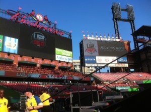 My friend Beth flew in the morning of the show. We talked the day before as she made last minute plans to come to St. Louis, so we decided that she would share the hotel room with Elvis, Cilla and myself. We relaxed in the hotel for a bit, then went to lunch on the way to Busch Stadium, which was only a couple blocks away. We had a great pasta lunch at Caleco’s thinking we should carb up to sustain the long day in the 110 degree heat!