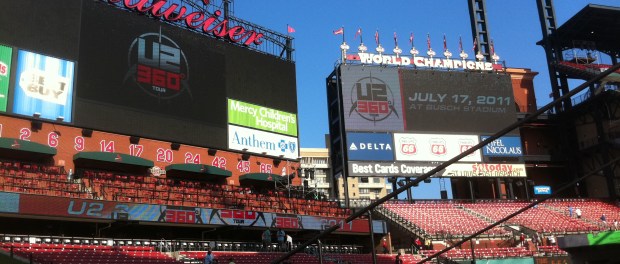 The U2 360 show in St. Louis was amazing! Definitely one of my top 5 for the tour behind Chicago and Anaheim2 and tied with Seattle and Baltimore. Even though it was a standard set list, the band had such a great energy, especially Bono – he was really excited and happy. The Fly returned after its brief departure in Philadelphia, and Magnificent disappeared again. Both Bono and Larry acknowledged me on their way onto the stage and then Bono gave me a ‘shout out’ during the band introductions. This St. Louis show was the hottest show so far, beating Baltimore and Nashville, with it’s 110 heat index.