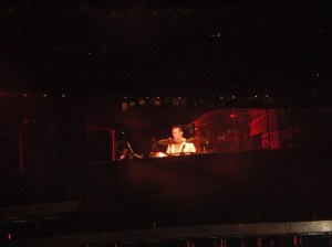 My excitement grew even greater when U2 followed the opener Even Better Than the Real Thing with The Fly, which they had removed from the set list in Philadelphia and replaced it with Magnificent. After The Fly, I knew the St. Louis show was going to be one of my favorites. U2 had such a great energy, and Bono seemed really excited and happy. The Fly was followed by Mysterious Ways and Until the End of the World, as usual but I just love 4 straight songs off Acthung Baby. And it doesn’t hurt that Larry starts Even Better than the Real Thing with his pounding drums and he and his drumkit turn around and face behind the stage during Mysterious Ways. The inner circle wasn’t that crowded, so I moved from my usual spot behind the stage and stood toward the side of the stage during Until the End of the World and I Will Follow and actually got pictures of the whole band.