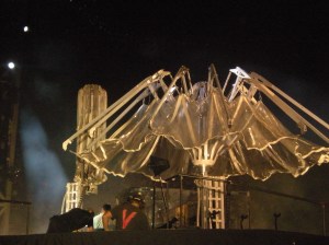 It started to rain toward the end of Mysterious Ways and continued throughout the show, raining harder and harder and lightning during the encore. It seemed that the pouring rain caused Larry lots of problems – he was constantly adjusting his seat. Also because of the umbrellas, Larry’s drumkit didn’t turn around during Sunday Bloody Sunday. Edge didn’t seem to like the rain at all. He didn’t go on the bridge during Until the End of the World, even though Bono was on the other bridge waiting.