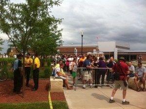 My hotel in Minneapolis was literally right next to TCF Bank Stadium, so I stayed in bed until 2pm and then got ready and walked over to the stadium. I walked around the entire stadium trying to figure out where U2 would drive in. I thought it might be this spot in the back, but continued around to the other side of the GA line where I saw the crew going in and out and a bunch of fans waiting. I finally met Wendy whom I’ve been chatting with on twitter and facebook for months. I also met Stuart and Paul and talked with Jason, Tim, Cathal, Suzi and Denise. I met Jill and her friends who were also at the shows in Anaheim. Turns out I should have followed my instinct and stayed in that spot around the back of the stadium where I thought U2 would drive in because that’s where they came in and I missed them – but no one stopped anyway.