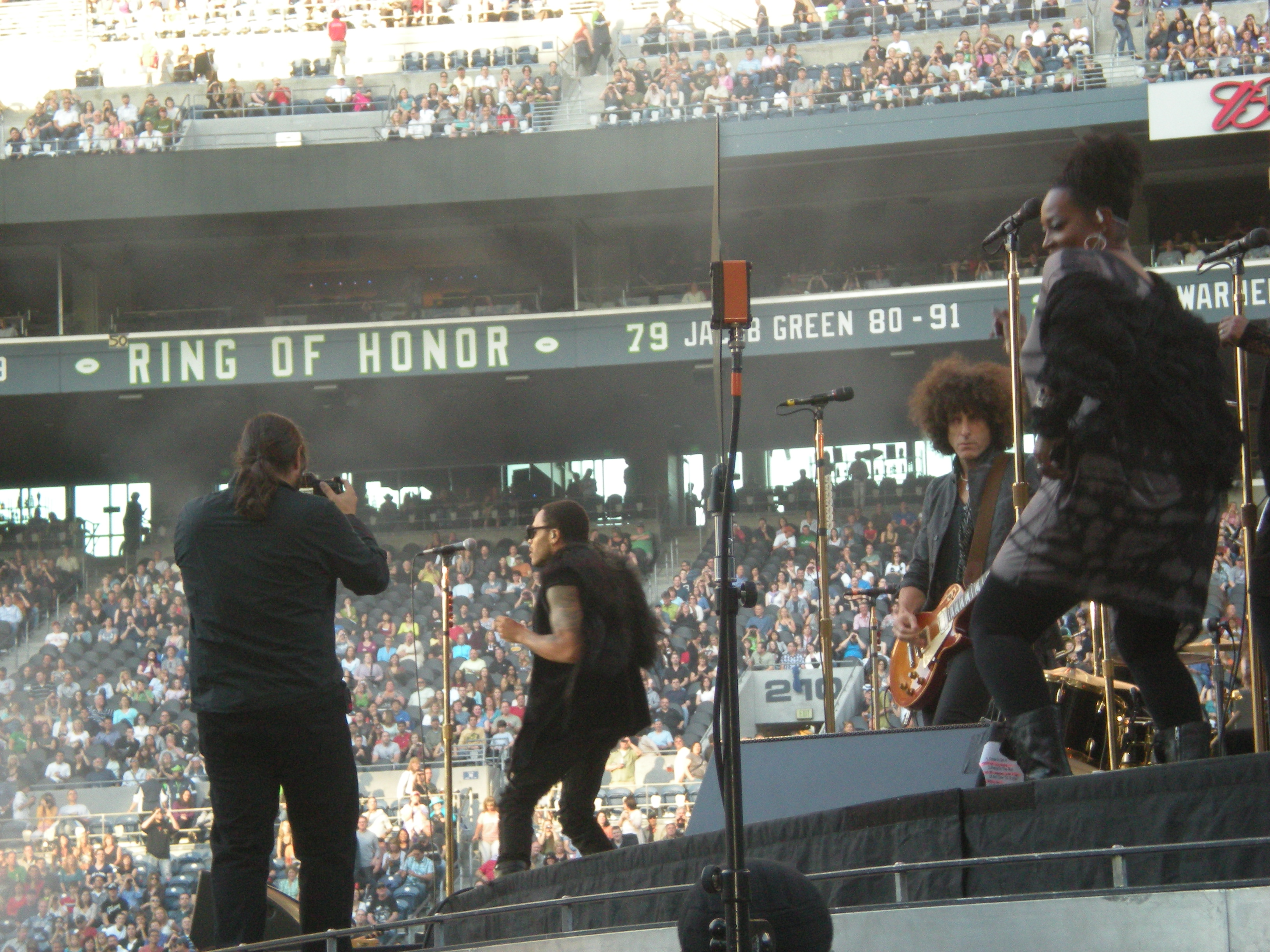 We got in the GA line and had about an hour wait in the hot Seattle sun before we were let into Qwest Field. While waiting we got to hear the sound check. I was quite excited to hear The Fly, but disappointed it wasn’t included in the set list later. Once inside, we got a nice spot in the inner circle on Adam’s side – a great view for Lenny Kravitz. Lenny was a great opening act, a lot better than The Fray. He didn’t take the stage until 7:30 and only played 45 minutes, but played the four songs I know – It Ain’t Over Til It’s Over, American Woman, Fly Away, and Are You Gonna Go My Way. Lenny had these great female backup singers that reminded me of Elvis’ Sweet Inspirations. Lenny also did karate moves that reminded me of Elvis. Could Lenny be a fan of The King? Please watch my video of an overview of Lenny Kravitz opening in Seattle.