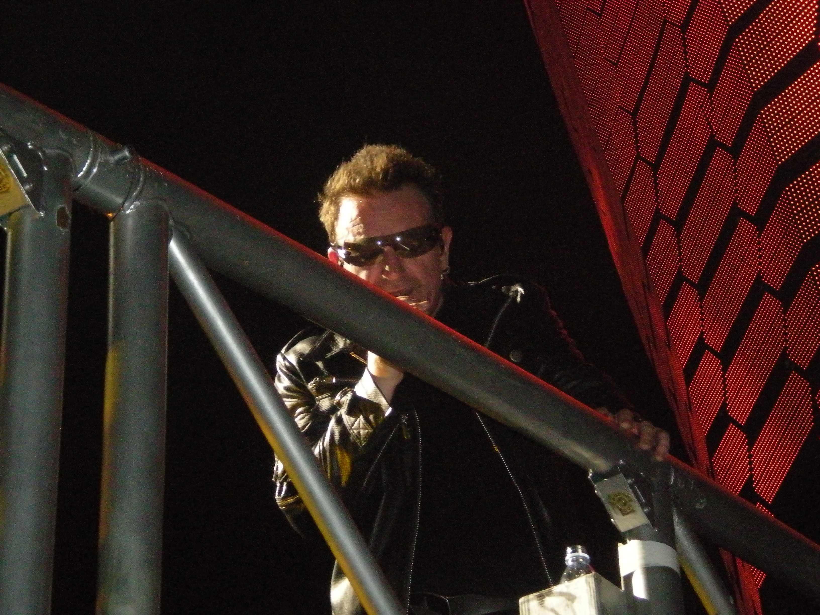 After Lenny Kravitz’ performance, we went over to Edge’s side and stood behind the stage to wait for U2 to enter. It was odd getting our neck’s stamped (instead of our hands) for re-entry to the inner circle, but this was to be the practice for most of the tour. Security kicked us off the rail where we were waiting for U2 to enter, claiming the fire marshall wanted that space cleared. So instead of having us lined up along the rail like we were, they had us lined up horizontally sort of blocking the way to the inner circle. Not sure how that wasn’t a fire hazard. This was also to happen for most of the tour. But as soon as U2 came out of that tunnel, security couldn’t hold us back and we were again on the rail. Larry came by and smiled at me, and I think he may have waved – of course I was screaming his name and wearing my Larry Mullen Band shirt. We decided to stay on Edge’s side for the show, and it was a good decision. We had a great view of the show. It was side view, but we could see everything. During Even Better Than the Real Thing,  Bono shouted, “The Emerald City shining in the sun.”