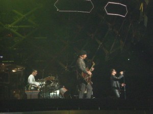 At the end of Vertigo, we went behind the stage to wait for Larry and his conga to start his walk for I’ll Go Crazy If I Don’t Go Crazy Tonight. He again smiled at me as I screamed his name and jumped up and down – actually I think he was laughing at me, but I’ll take it. For Moment of Surrender, we moved behind the stage to wait for U2 to leave. Instead of standing by the stairs at the stage where we could have gotten a good picture, we waited back toward where the tunnel is. As Larry was walking out, Jenny shouted, “Larry!” He smiled and made a b line for us. He shook Jenny’s hand and then mine – still smiling. I thanked him. Excited as I was, I thought to myself that this does not excuse Larry from coming out to meet me in Oakland, assuming Bono gives him my message.
