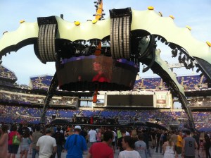 When we arrived at Ravens Stadium, we walked around the stadium to see where U2 would arrive, sat under a tree and waited. It was so hot that day in Baltimore. It proved to be one of the hottest shows of the tour, even hotter than Miami. U2 drove in a couple hours after we arrived, but again they did not stop. I was really disappointed because I thought they would definitely stop in Baltimore like that had 10 years prior, plus they hadn’t stopped before either show in Anaheim. We got into the inner circle, and it wasn’t crowded yet. We would have had a great view, but we decided to walk around. We ran into our friends (Mike, Abbey, Rob, Lisa) at the soundboard and watched Florence and the Machine. She was good, but a little too screamy for me. I definitely preferred Lenny Kravitz.