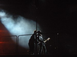 As I did every show, I went behind the stage to wait for U2 to enter the stadium. This time they came out of the tunnel on Adam’s side, but still walked onto the stage on Edge’s side where I was. As Larry walked by, he smile and waved at me like usual but the look in his eyes was one of surprise that seemed to say, ‘You’re here too? Didn’t I just see you in Anaheim?’ He kept looking at me. Then I was jolted out of my Larry bliss by a severe pain in my arm. A woman I had just met, Cindy, was standing next to me and was SO excited to see Bono walk by that she pinched my arm so hard that it hurt for 3 songs – and bruised for 3 days!