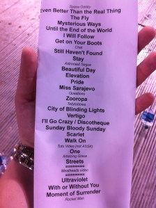 At the end of the show, I wanted to watch U2 leave thinking maybe Larry would come over to me like he did in Seattle. We could see their cars parked in the tunnel – they were so close they were almost inside the stadium. When they left the stage, U2 walked straight to their cars, they didn’t even look over to us. But I kept watching Larry. He was almost at his car when he tore off his shirt, and I saw his naked back! Then he put on a black robe. That was almost as good as a handshake. We watched the cars pull away and stood there soaking (and screaming) in the moment. Then someone from the crew came over to me and gave me the set list.