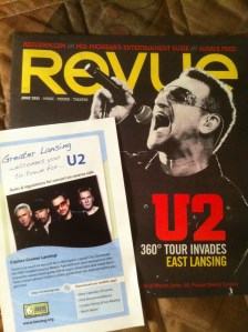 They were very excited in East Lansing for the U2 360 show. There was a U2 flyer and a newspaper with U2 on the cover at the front desk of my hotel, the Howard Johnson. Apparently U2 hadn’t played in East Lansing since the early 1980s and there hasn’t been a stadium concert there since the Rolling Stones in the early 1990s. I had never been to Michigan before, but I didn’t have time to do any sight seeing. I just had just enough time to drive up from Maryland, see the U2 show, and then drive down to Miami for the next U2 show.