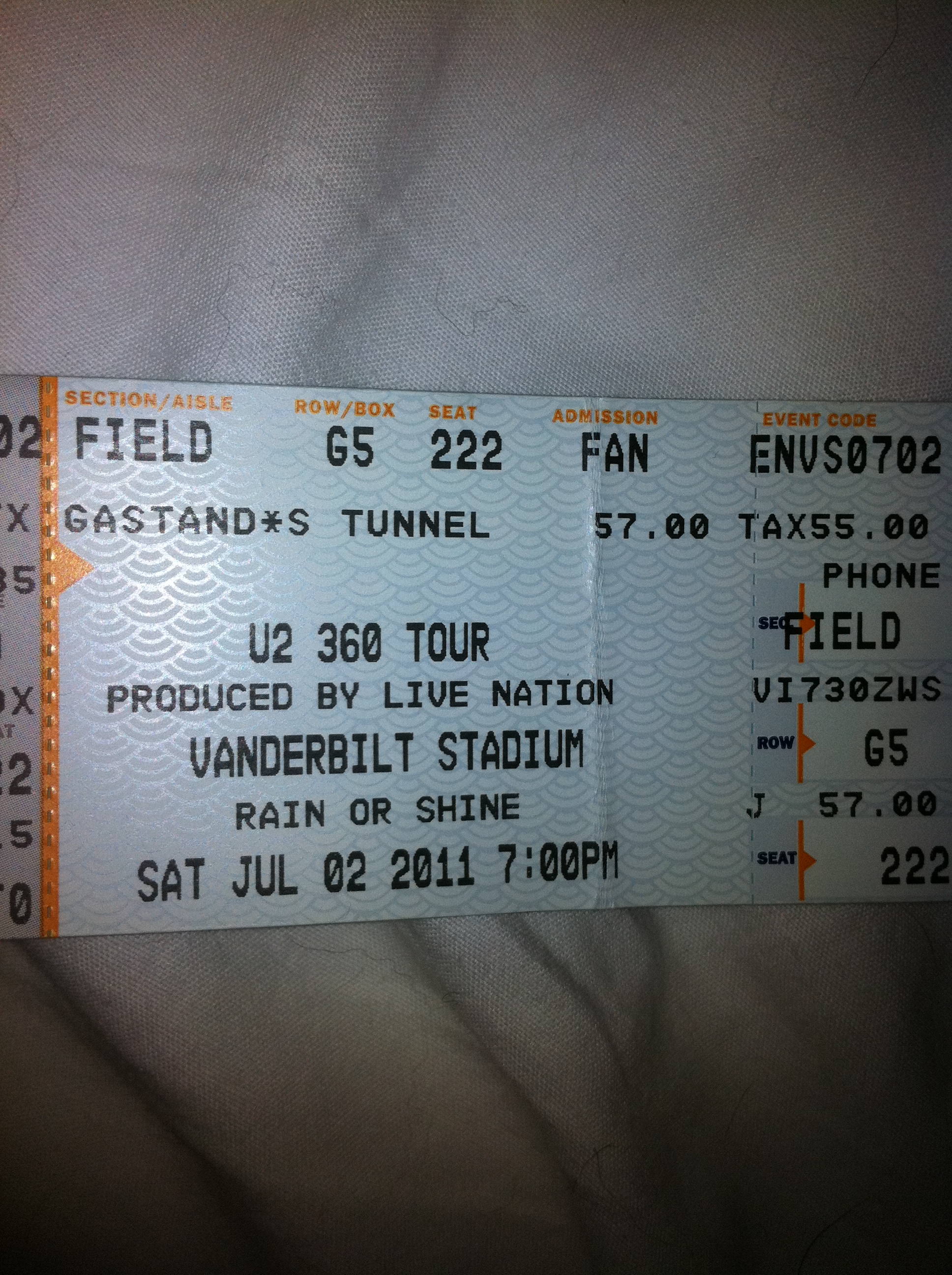 The U2 360 show in Nashville was fantastic, which was a nice reward for that long trafficy 16 hour drive from Miami the day before. It was the 50th day on my U2 360 across America tour, my 10th show that leg of the tour, my 69th U2 show overall and the 100th show of the entire 360 tour. I had been really looking forward to the Nashville show not only because it was sort of my hometown show (3 hours from Memphis where I lived at the time), but also because U2 hadn’t played in Nashville since 1981. I wasn’t disappointed. There were some great moments at that U2 360 show in Nashville. U2 played The Wanderer for the first time, honoring Johnny Cash. And after Moment of Surrender as U2 was walking off stage, Bono pulled a blind guy up on stage who played guitar while the band came back and played All I Want is You and then Bono gave him his green ‘goal is soul’ guitar.