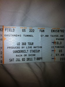 The U2 360 show in Nashville was a great show! It bumped Baltimore out of the spot for my second favorite show, and may even be better than Seattle – although Larry did shake my hand at the Seattle show. But in Nashville I saw Larry arrive and get out of the car and walk into the building, which I hadn’t seen Larry arrive at any of the previous 9 shows. We got two extra songs in Nashville – the first time playing of The Wanderer in memory of Johnny Cash, whom I love, and All I Want is You was played with a fan on stage who got to keep the guitar. Also I got to hang out with a lot of my friends – Tasha, Chuck, Jennifer, Melissa, and others. I didn’t take many pictures, which is proof I was really into the show. It was hot though – hotter than Baltimore even.