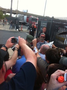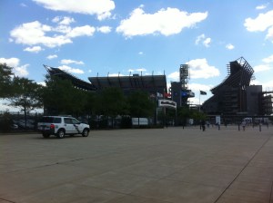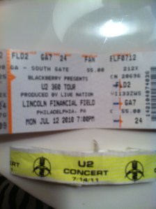 I took a cab from my fabulous Hotel Palomar to Lincoln Financial Field around 3. I walked around the stadium and ran into Ayaz, Kim and Abbey – my friends from the Elevation tour. I finally arrived at the spot where U2 was going to drive in. Along the way, I met Christine and Natasha whom I’ve been talking with on Facebook. Christine also lives in Maryland, and Natasha is also a huge Larry fan who is considering moving to Maryland. My old Elevation friends Jenny and Tasha were also there. U2 drove in after 4pm. Bono came out to greet everyone, but the Philly fans got a little too excited and I couldn’t even get near Bono to see him, let alone talk with him. He didn’t stay very long, and I don’t blame him.