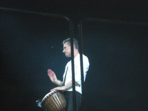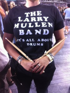 We went into Edge’s side of the inner circle and stood behind the stage to get our spot to watch U2 enter the stadium and go on stage. Rob, another friend from the Elevation days, joined us – as did Jenny and my new friend Andrew. I met Chris who I’ve been talking with on Twitter. Jenny and I were wearing our ‘Larry Mullen Band’ shirts and Natasha was wearing her ‘It’s All About Drums’ shirt. Dallas said Hello, shook my hand and complimented me on my hat and then said, ‘\”its not about the drums its about the guitar.” When opening band Interpol walked on stage which wasn’t until after 7:45, the drummer noticed our shirts and pointed at us. Then after their set when they were walking off stage, the drummer gave his drumsticks to Jenny and said, “This is for my love of Larry.”