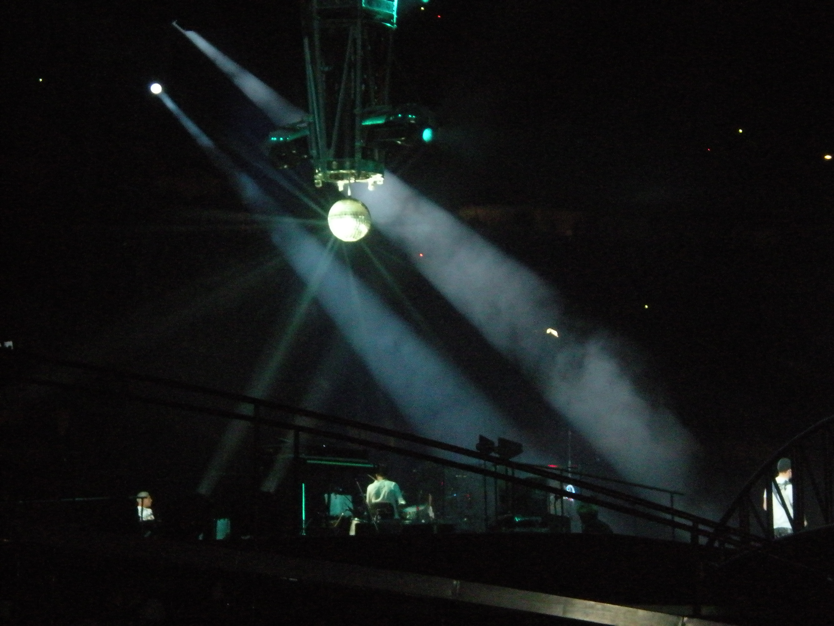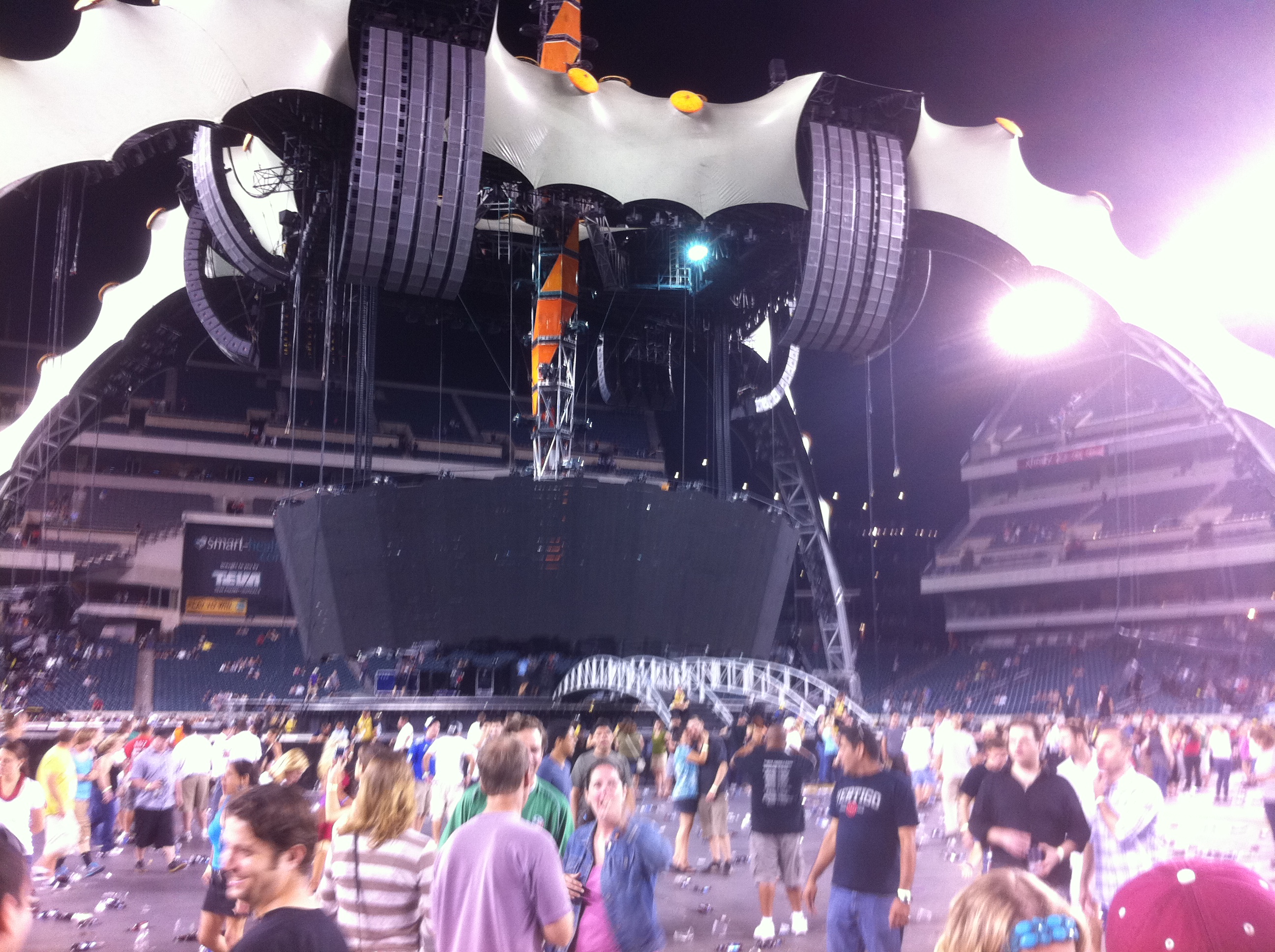 After sort of seeing Bono, Natasha and I walked back around the stadium and went to the front of the GA line to watch everyone enter. I got to talk with my friend Beth for a little bit and finally met Anthony! I also got to catch up a bit with Cathal, author of Me and U2. We heard the crew sound check Breathe and U2 sound check Magnificent, so it wasn’t a real surprise when they played it. Unfortunately, no Breathe though. Natasha and I went into the stadium after the enter GA line filed in. It was quite a complicated walk down to the inner circle, which was already pretty crowded at 5:30. In fact, Adam’s side was closed.