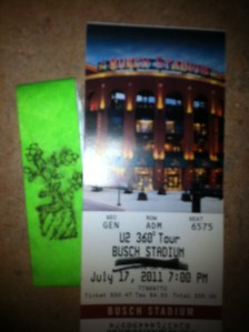 The U2 360 show in St. Louis was amazing! Definitely one of my favorites, along with Chicago and Anaheim2. Even though it was a standard set list, there was no Out of Control or One Tree Hill, the band and the audience had such a great energy. Bono was especially excited – he was really excited and happy. The Fly returned after its brief departure in Philadelphia, and Magnificent disappeared again. For the first time both Bono and Larry acknowledged me on their way onto the stage and then later Bono gave me an indirect ‘shout out’ during the band introductions. The St. Louis show was the hottest show of the tour, beating Baltimore and Nashville, with its 110 heat index.