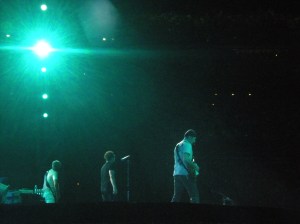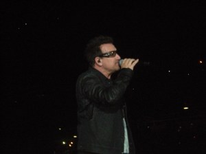 My excitement grew even greater when U2 followed the opener Even Better Than the Real Thing with The Fly, which they had removed from the set list in Philadelphia and replaced it with Magnificent. Introducing The Fly Bono said, “Are you ready for some crowd rock circa 1991? We’re not gonna walk, we’re not gonna crawl. Tonight St. Louis, we Fly!” After The Fly, I knew the St. Louis show was going to be one of my favorites. U2 had such a great energy, and Bono seemed especially excited and happy. The Fly was followed by Mysterious Ways and Until the End of the World as usual, but I just love four straight opening songs off Achtung Baby. And it doesn’t hurt that Larry starts Even Better than the Real Thing with his pounding drums and then he and his drum kit turn around and face behind the stage where I am during Mysterious Ways. But the inner circle wasn’t that crowded, so I moved from my usual spot behind the stage and stood toward the side of the stage during Until the End of the World and I Will Follow and actually got pictures of the whole band. During Until the End of the World, Bono again said “Bass and Drums” and then “Love and Peace.” He went on to say, “What sort of magic night is this? St. Louis. Missouri. Warm summer night.” During I Will Follow, Bono said the most important word of the night was ‘surrender.’ He sang, “I surrender. St. Louis. We surrender.”