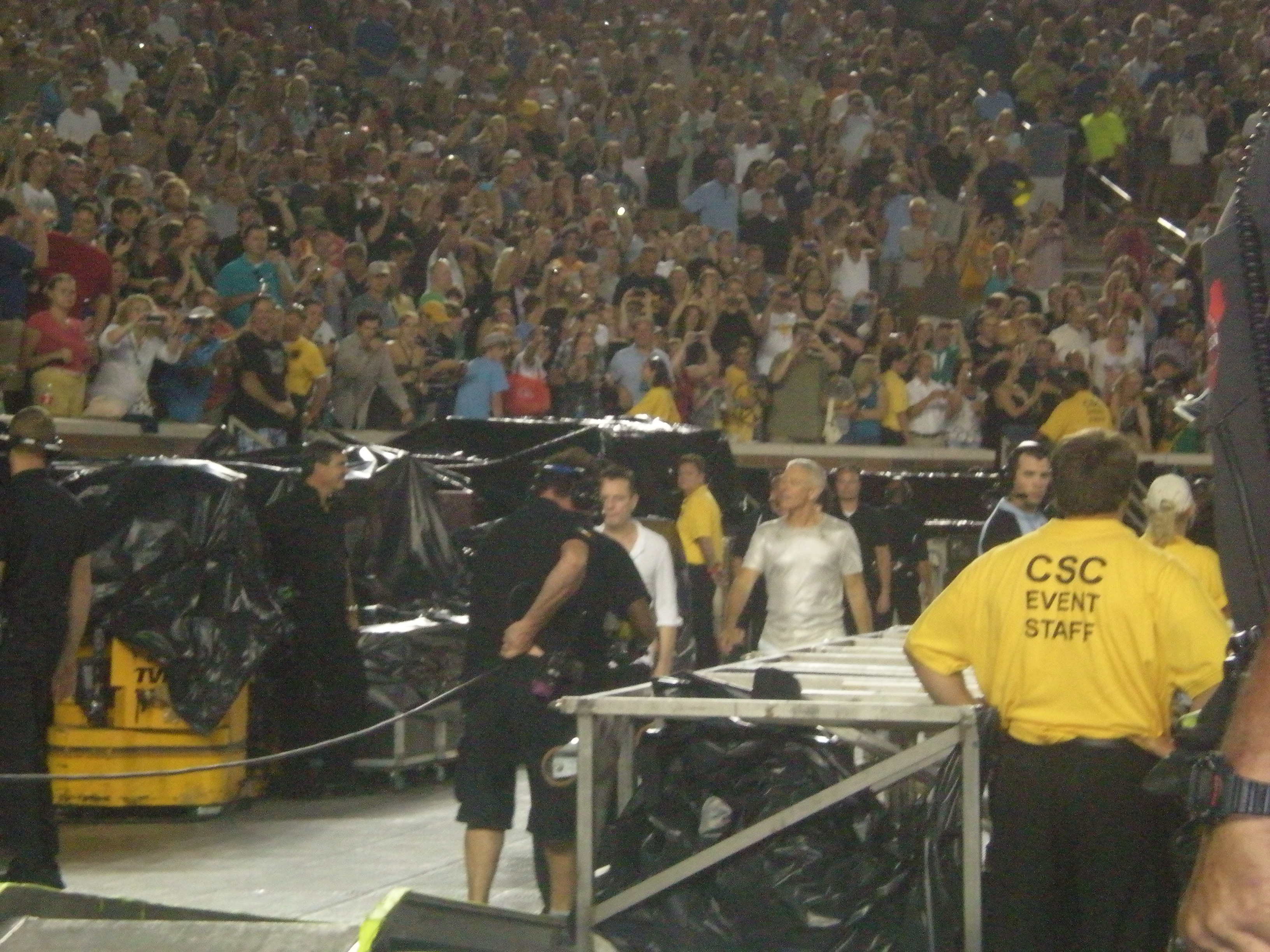 Unfortunately, the rain did cause some problems for Larry. He seemed to be uncomfortable, he was constantly adjusting his seat throughout the show. And because of the umbrellas, Larry’s drum kit didn’t turn around during Sunday Bloody Sunday – much to my disappointment. Bono wore his army green hat during the encores. I did not walk around to Adam’s side after Scarlet as usual to wait for U2 to leave because I was afraid I would fall in the pouring rain on the way over. Instead, I stood at the stairs and watched U2 leave the stage. Larry again saw me and smiled and waved.