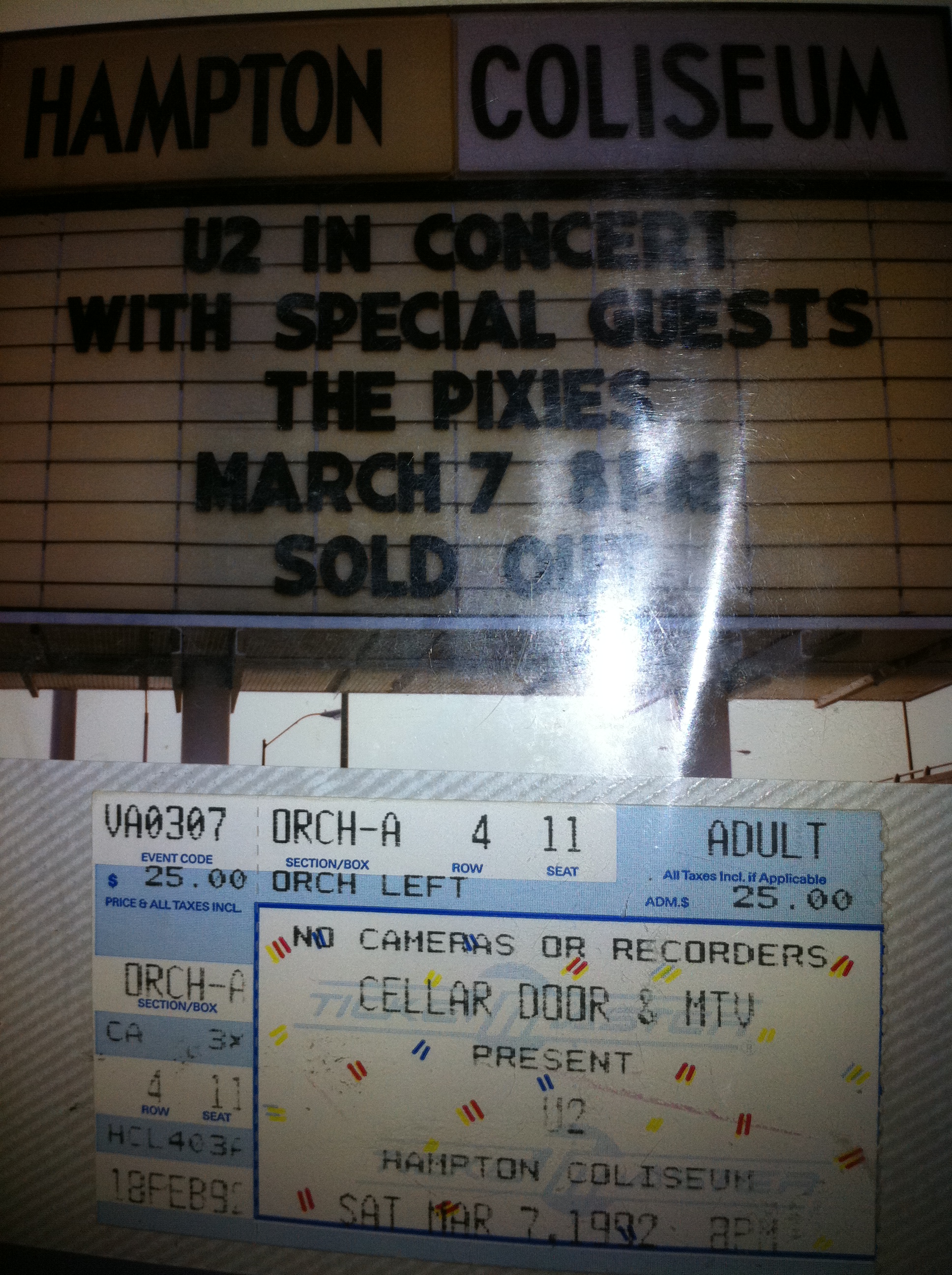 My musical journey on the road with U2 started in Hampton, Virginia. It was Saturday March 7, 1992, and I was 19. My first U2 show was the fifth of the ZooTv Tour. On the morning of March 7th, my best friend Cindy and I drove four hours south from Ellicott City, MD to Hampton, VA. Back in those days, there was no need to get to the city of a concert a day early because there was no general admission – we had actual assigned seats on the floor. We checked into our hotel and immediately walked across the street to the Hampton Coliseum, even though it was hours before the concert was to start. We saw a small circle of people with a big microphone hovering over them. As we got closer, we realized Bono was in the middle of that circle! I didn’t speak with him, but got close enough to take pictures and to hear what he was saying to everyone else. For my first U2 show, I was seated in the fourth row in front of The Edge. Bruce Hornsby and Phil Joanou walked in from behind the stage and passed by us on their way to the soundboard. The Pixies opened, and I did not like them at all. But then again, I just wanted to hear U2. I had waited five years since the release of The Joshua Tree to see them in concert!