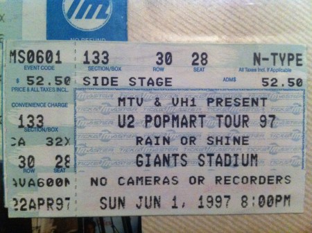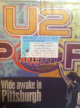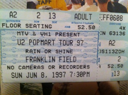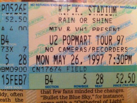 The Popmart show at RFK Stadium Washington, DC on May 26, 1997 was great. I was 5th row from the stage. Everyone I knew was there, since I had gotten tickets for most of my friends. It rained as it had on ZooTv, but it really poured this time. The set list for this show was the same as the ones in Pittsburgh and Columbus, except Unchained Melody was not played in Columbus and Edge sang Sweet Caroline in Pittsburgh. The set list for Popmart DC was as follows: Mofo, I Will Follow, Even Better Than the Real Thing, Gone, Pride, I Still Haven’t Found What I’m Looking For, Last Night on Earth, Until the End of the World, If God Will Send His Angels, Staring at the Sun, Daydream Believer (Edge Karaoke), Miami, Bullet the Blue Sky, Where the Streets Have No Name / Playboy Mansion, Discotheque, If You Wear That Velvet Dress, With or Without You, Hold Me Thrill Me Kiss Me Kill Me, Mysterious Ways, One, Unchained Melody.
