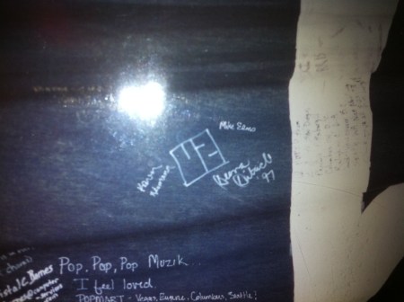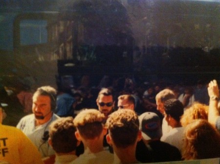 My first Popmart show was on May 22, 1997 at Three Rivers Stadium in Pittsburgh, Pennsylvania. We I drove the five-hour drive from Baltimore. While waiting outside the stadium I met Ken, one of the guys on the crew who drove one of the trucks that carried parts of the elaborate Popmart stage from city to city. Ken was to be a source for a couple cool U2 experiences. A couple of days later, we drove three hours from Pittsburgh to Columbus, Ohio for our second Popmart show on May 24, 1997 at Ohio State University. We saw Bono get off the bus, but he was swarmed by fans. It wasn’t orderly as it had been on ZooTv. We got a few pictures though. We also signed the banner hanging outside the stadium. Our seats weren’t too close for this show.