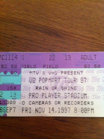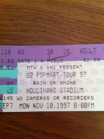 I traveled to Florida for the third leg of the Popmart tour. My parents have a condo in Ft. Myers, so I had a free place to stay. We flew down to attend the shows in Tampa and Miami, both about a two hour drive from Ft. Myers. At the time, the Popmart show at Houlihans Stadium in Tampa on November 10, 1997 was my favorite U2 show I had seen, including all of ZooTv and Popmart. I think mainly because I stood right on the b stage, rather than staying in my seat. There was nothing between me and the stage. And for Popmart, U2 entered through the crowd and onto the b stage. I thought they sounded better than the shows I had seen on the first leg. It was raining and the top deck of the stadium was empty, but it was a great show! Third Eye Blind opened, and I really liked them. Instead of karaoke like in the first leg, Edge sang Sunday Bloody Sunday, and a belly dancer from the audience came on up on stage for Mysterious Ways, like during ZooTv. I didn’t know it at the time, but that belly dancer was Melissa Pruitt who would become my friend four years later. A few days later on November 14, 1997 we drove over to Pro Player Stadium in Miami for my last Popmart show. We again did not stay in our seats and stood right at the b stage. I grabbed onto Bono’s leg (sort of hugged it actually) as he leaned over into the crowd. Although I have always been a Larry fan, I was really digging Bono during Popmart. The set lists for both the Tampa and Miami Popmart shows were the same (except they played Miami in Miami): Mofo, I Will Follow, Gone, Even Better Than the Real Thing, Last Night on Earth, Until the End of the World, New Year’s Day, Pride, I Still Haven’t Found What I’m Looking For, All I Want is You, Staring at the Sun, Sunday Bloody Sunday, Bullet the Blue Sky, Please, Where the Streets Have No Name, Discotheque, If You Wear That Velvet Dress, With or Without You, Hold Me Thrill Me Kiss Me Kill Me, Mysterious Ways, One, Wake Up Dead Man.