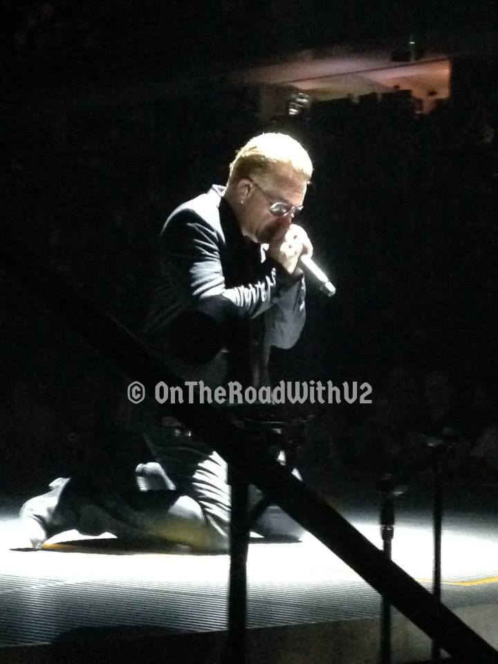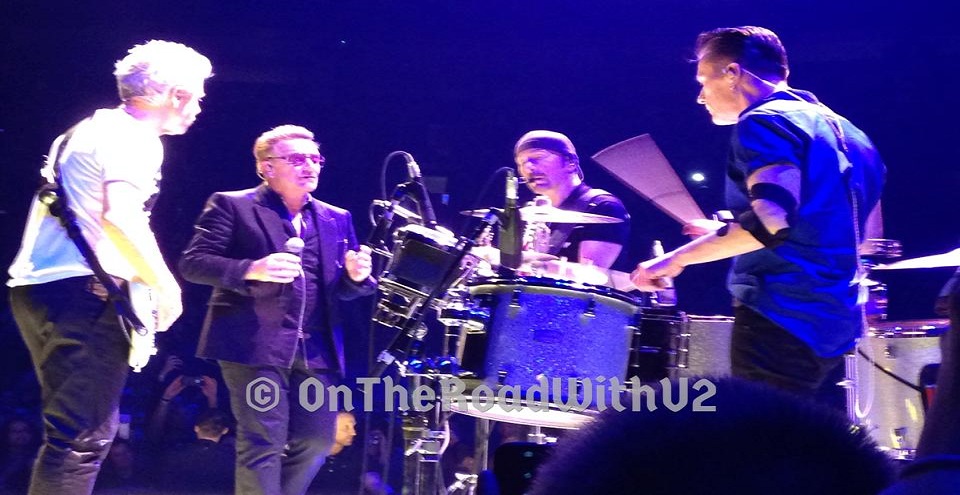 The U2ieTour Opener in Vancouver on May 14, 2015 went as follows: “The Miracle” (main stage), “Out of Control” (main stage), “Vertigo” (main stage), “I Will Follow” (main stage), “Mofo” snippet / “Iris” (with Bono on the runway) , “Cedarwood Road” (with Bono in the screen), “Song for Someone” (Bono on e stage), “Sunday Bloody Sunday” (band on runway), “Raised By Wolves” (Bono and Edge on runway), “Until the End of the World” (Bono and Edge on runway), Intermission with Punk Interviews (5 minutes), “Invisible” (band inside screen), “Even Better Than the Real Thing” (band inside screen then e stage), “Mysterious Ways” / “Burning Down the House” and “Young American” snippets (band e stage), “Desire” / “Love Me Do” snippet (band e stage), “Sweetest Thing” (band e stage, Bono playing piano and fan Reilly Hannigan filming with Bono’s phone), “Every Breaking Wave” (Bono and Edge e stage), “Bullet the Blue Sky” / “Hands that Built America” snippet (main stage), “Pride” (main stage), “Troubles” (Bono on e stage with his dance moves), “With or Without You” (Bono on e stage), Encore break with Stephen Hawking intro, “City of Blinding Lights” (main stage), “Beautiful Day” (Bono on runway), Paul Simon’s “Mother and Child Reunion” (main stage), “Where the Streets Have No Name” with “California” snippet (Bono on runway), “I Still Haven’t Found What I’m Looking For” (main stage then band walks runway to e stage and exits).