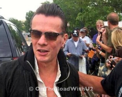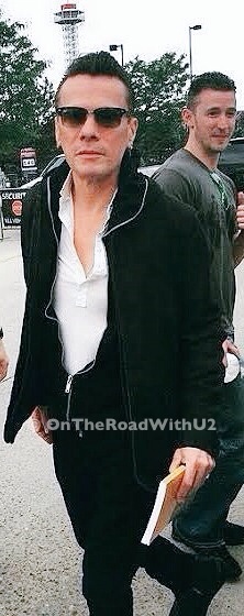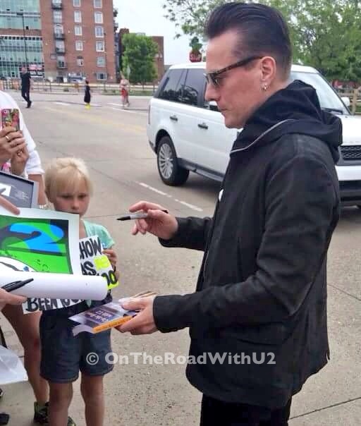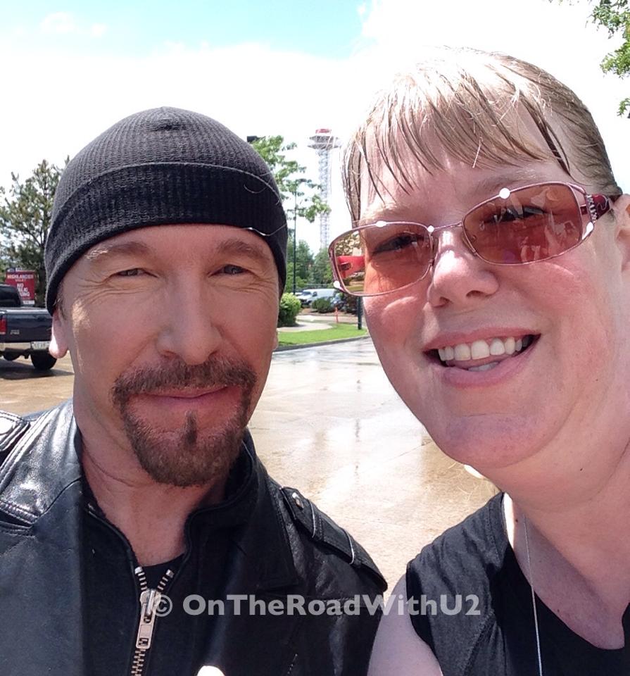 There were about 15 to 20 people waiting for U2 arrive when I got there. Within a half hour it started to rain, then it started to pour and then it started to really pour as in standing rain up to the curb with a cold sideways rain. Everyone left but about seven of us, including Dahna and Jen. We stayed too long and there was no point to leave after we were already soaked. We would have gotten even wetter walking through the downpour. So we just stood under a tree with our hoods on. It probably rained for about a half our or so and then the sun came out, bright hot sunshine to help dry us off. Everyone who was there came back and we were chatting when all of a sudden a black suv pulls up taking us by surprise because it was only 2:15pm. But it was The Edge! We all scrambled to line up on the curb with our cameras. We were told Edge would not sign anything, but he would take pictures. When Edge walked up to me, I was still trying to figure out my phone camera and make sure it was turned on selfie mode. Luckily I snapped a quick photo (my hair still dripping). I don’t even think I said hello to the man, who is gorgeous by the way (just beautiful bone structure and oh so sweet). Edge greeted everyone waiting. This was my third time meeting Edge, but my first picture with him. I first met Edge 14 years ago on Elevation in Philly and got his autograph, and I met Edge a second time in 2011 on 360 in Chicago and shook his hand.