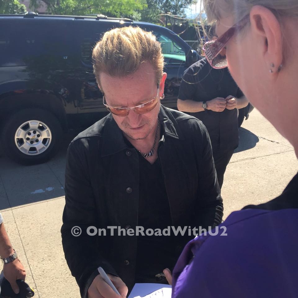 Maybe about 15 minutes later, Bono arrived. There were even more people now, and Bono started at the opposite end of the line where the people had just arrived. Unlike my encounter with Larry, I remember every detail of my time with Bono – because I am much calmer with Bono. When Bono arrived in front of me I showed him my book and told him, “This is the book I wrote about all the U2 shows I’ve been to over the years.” And Bono said, “Really?” with an impressed, surprised sort of tone. I then said, “I gave a copy to Larry because you know I like that cold stare.” Bono said, “I do too” and his eyes lit up and looked at me with a little smirk as if saying to himself, “This girl is quoting me to me.” And I was. (I was referring to my conversation with Bono in 2011 on 360 in Seattle when I asked him if Larry was ever going to come out to greet the fans, and Bono said, “You like that cold stare don’t you?” – click here to see that video). After Bono autographed my book, I pointed to my “Larry Mullen Band” shirt and said, “You remember me … from Seattle?” Bono said, ” Oh YEAH I remember YOU!” I’m not sure if he did or was just playing along, but it was a great moment either way. I then thanked Brian (Bono’s security guard) for Pittsburgh (Larry hugging me on his way to the stage), and asked him if he remembered me. He said, “You’re welcome. Yes I remember.” Again, who knows if he did, but I’ve wanted to thank him for that magical moment because it was all due to Brian. (You can read about that here.) I have met and spoken with Bono a handful of times over the years, but this was only the second autograph I have gotten from him. The first time I met Bono was back in 1992 on ZooTv. I got my picture with him and his autograph – he signed my Outside It’s America book.