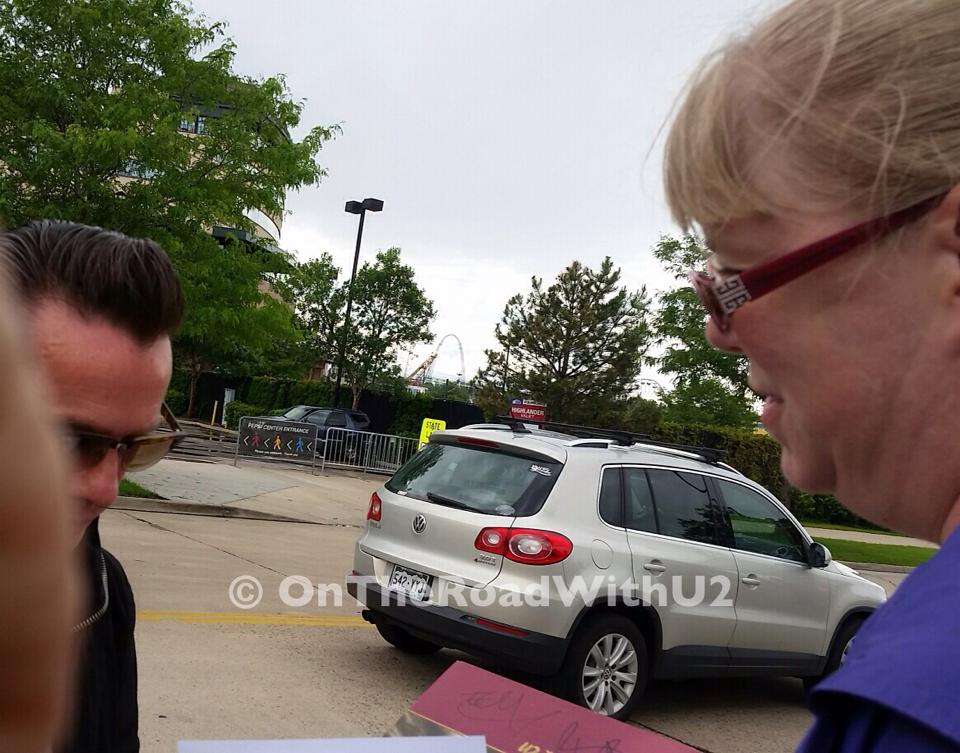 I woke up at 5am after only two hours of sleep. I went down to the lobby just after 7am to get my free breakfast – fruit loops, juice and an egg and cheese croissant sandwich for later. There was nothing in the newspaper at the U2 concert. I tried to go back to sleep, but just ended up watching the SVU marathon and only dozing off for a few minutes. After eating my leftover pizza, I finally got out of bed around 12:30 to get ready to go back over to the Pepsi Center. I wanted to thank Larry for the drumsticks and finally get my picture with him. The same folks were waiting that were there yesterday (Dahna, Jen, Doug, Mel, Marcy, Deb), but there were a LOT more people on Sunday. Guess everyone heard about our good fortune Saturday and didn’t want to miss out again. My friends Mike and Jennifer joined us Sunday – after I talked about it so much Saturday. Two SVUs drove in pretty quickly and as it turned out they were Edge and Larry. Oh well, I will try again in Chicago. Although I already achieved my goal, so a photo with Larry is just icing on the cake. Brian came out and told us that they were not going to sign anything and just say a quick hello, but both Adam and Bono quickly autographed items and took a few pictures. After a bunch of us went over to Brooklyn’s at 3:30 to relax, hydrate and eat before the show. Side note – I took little videos of Edge, Adam and Bono greeting the fans, but not Larry! WTH?!